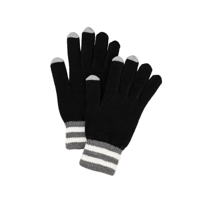 Part of Verloop's bestselling range of knit gloves designed to work with touchscreen devices. Knit gloves with a contrasting striped cuff—a fun and happy update to a classic winter accessory.