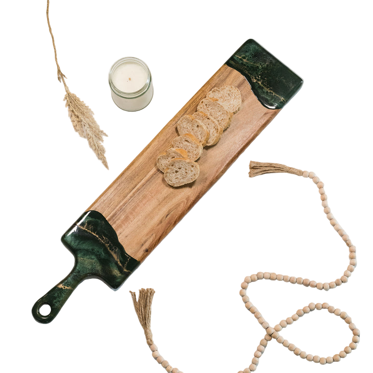 These pieces blend gorgeous Acacia hardwood and an eco-friendly resin to create a one-of-a-kind piece of serveware for your home. These baguette boards are perfect for serving a group of 3-5 people.