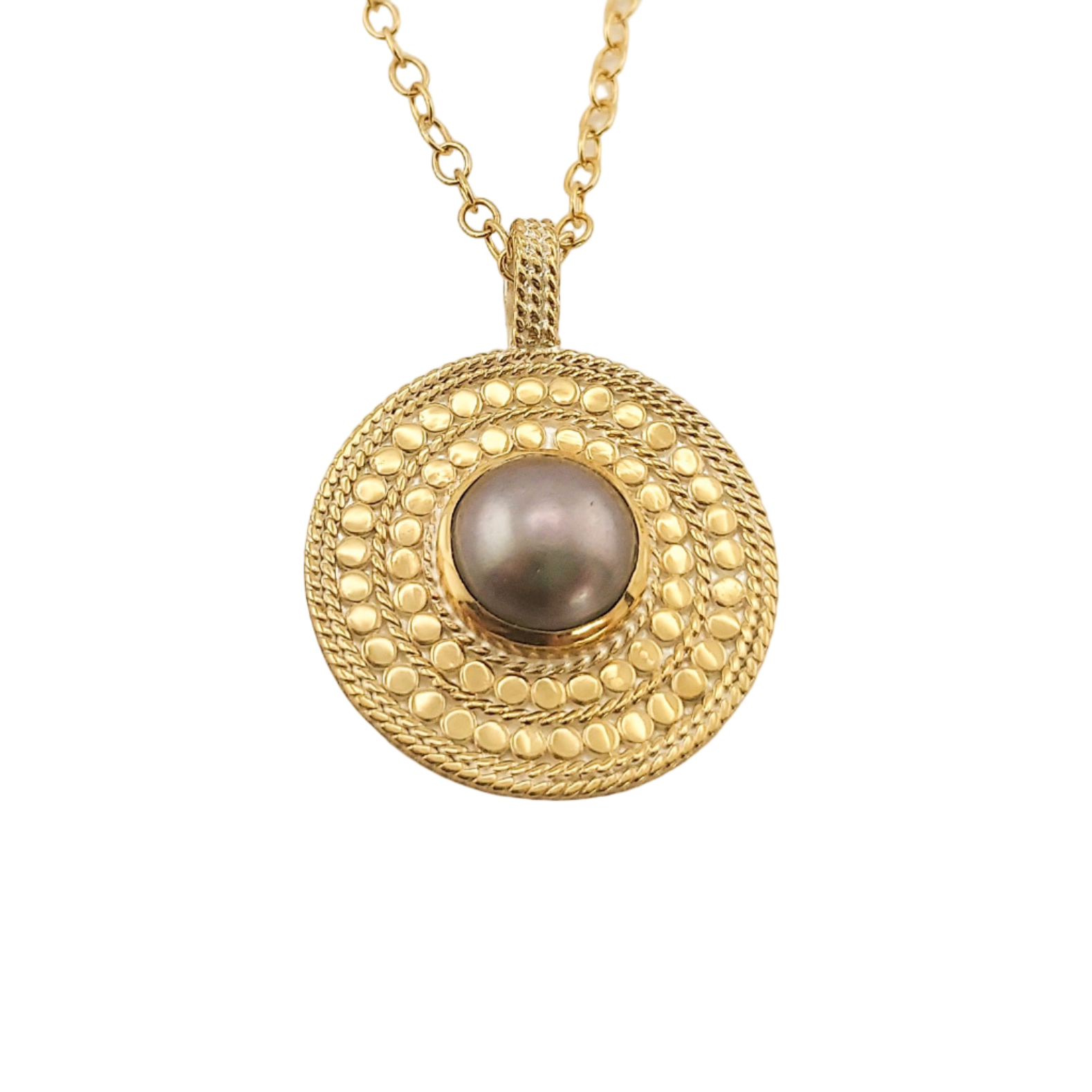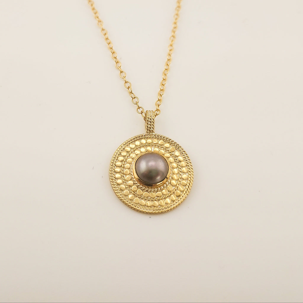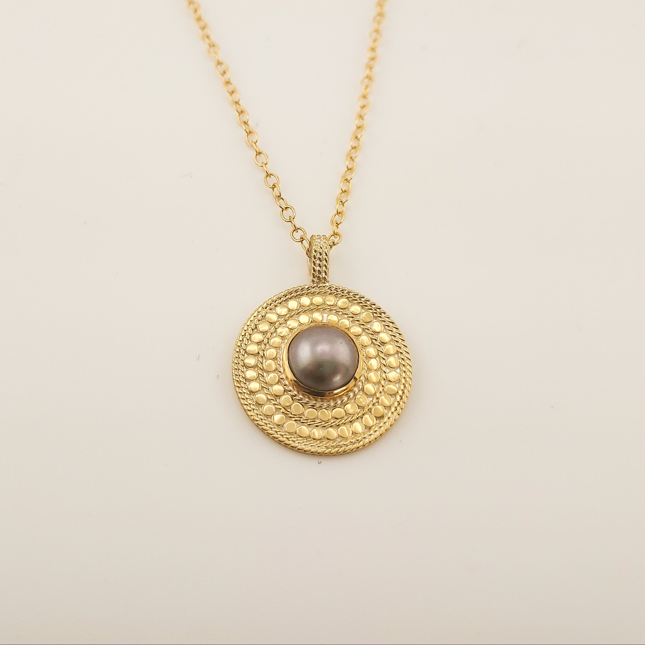 Handmade by artisans in Bali, this gold necklace by Anna Beck uses a technique that involves hand placing each dot to form a scalloped edge. The result is eye-catching textured detail that looks great with every style. This necklace features a beautiful blue pearl in the center of the medallion style pendant, making it a stand out piece!