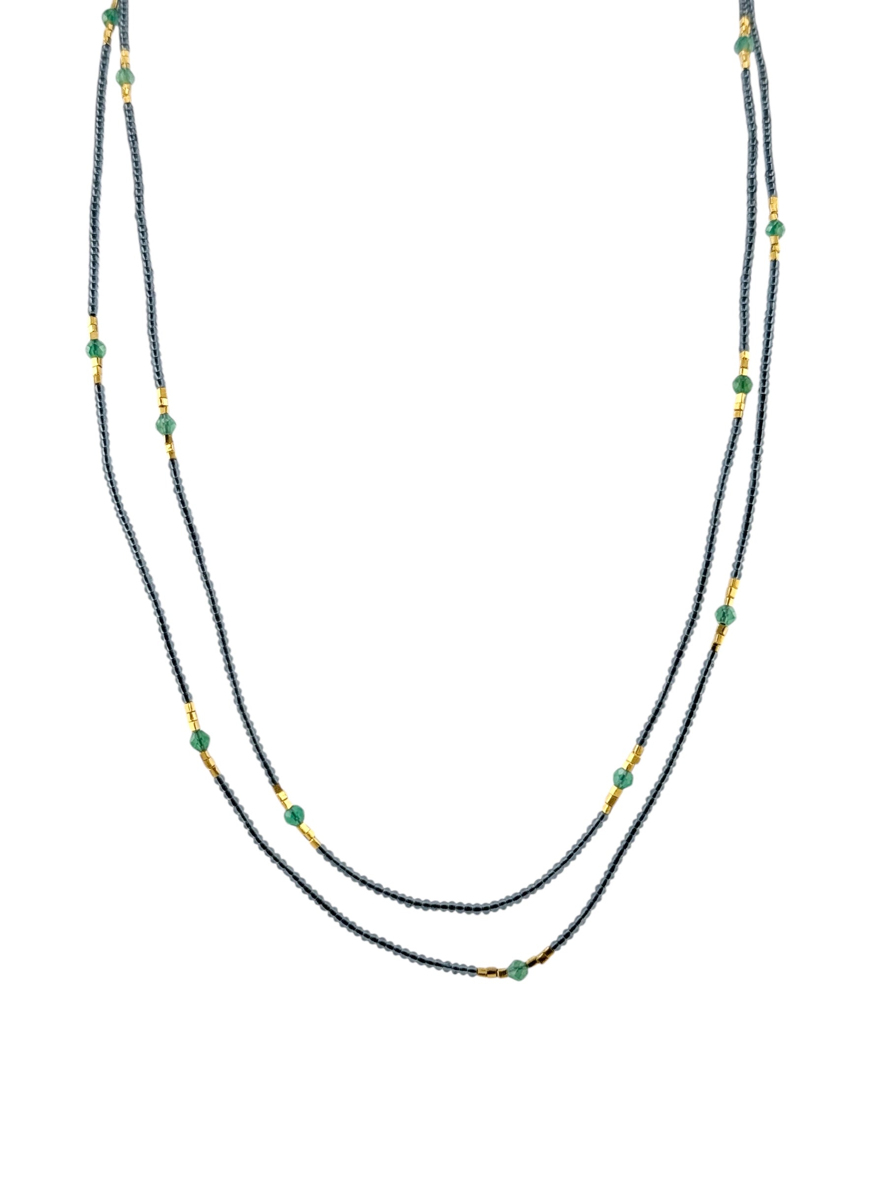Debbie Fisher's stunning necklace features vermeil and grey seed beads interspersed by striking green onyx. Wear it long or double wrapped for a layered look. This necklace is a great addition to any outfit!
