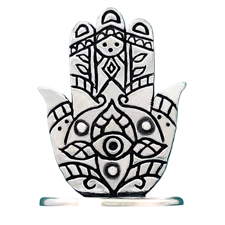 This exquisite pewter plaque features a beautifully crafted hamsa hand adorned with an eye, symbolizing protection and good fortune. The intricate design showcases the artistry of the piece, making it a perfect addition to any home or office decor. Each plaque is elegantly boxed, making it an ideal gift for loved ones or a meaningful personal keepsake.