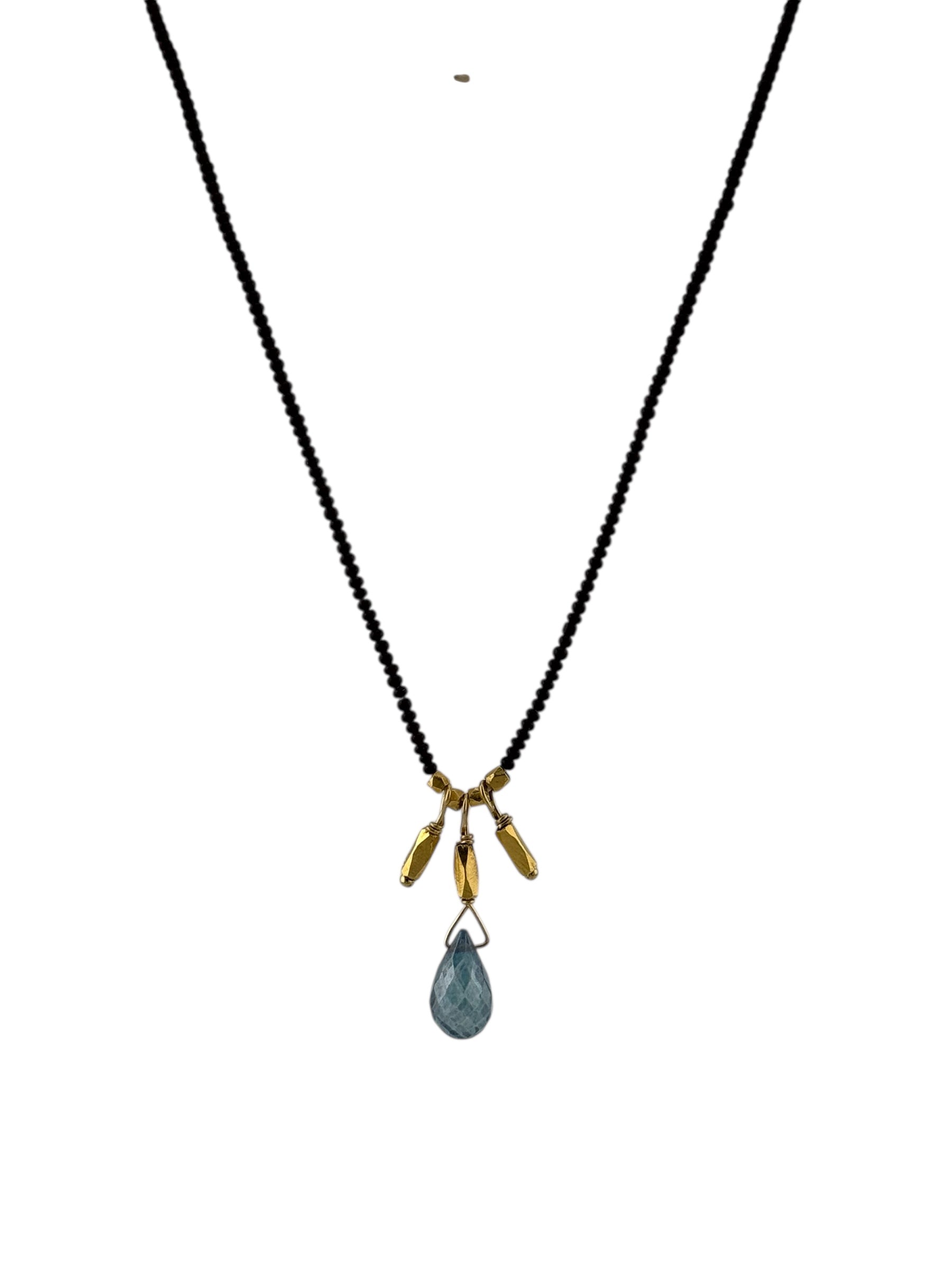 Debbie Fisher's stunning necklace features dark brown seed beads culminating in a gorgeous blue mystic quartz drop framed by gold vermeil beads. Whether layered or worn alone, this necklace adds a great pop of color to any outfit!