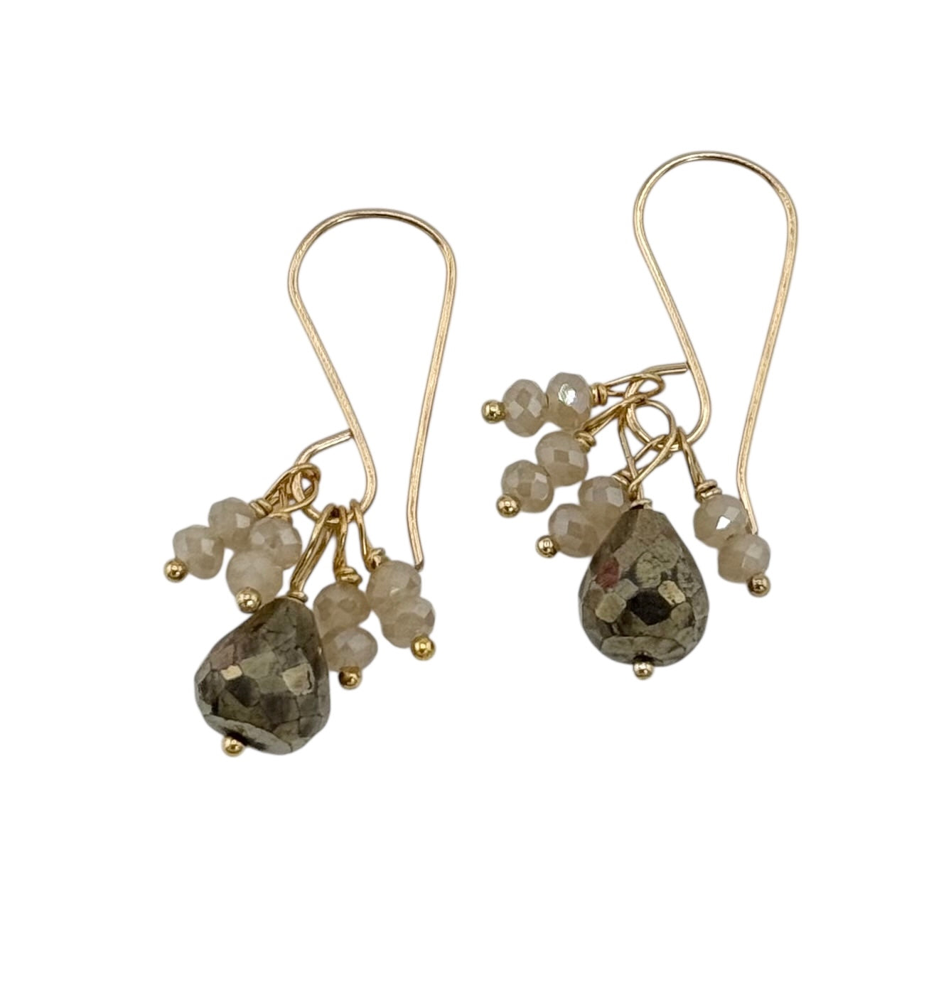 Bold and classy, Debbie Fisher's earrings feature bright pyrite drops paired with a delicate cluster of small sandy quartz beads. These earrings create a look that's both elegant and modern. Lightweight and versatile, they add a touch of calm sophistication to any outfit.