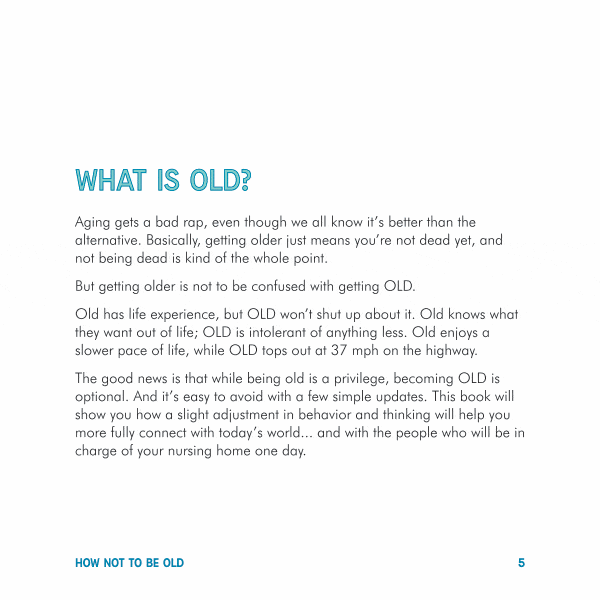 Old suggests you have life experience, but OLD means you won’t shut up about it. Old brings with it a more relaxed pace of life, while OLD is synonymous with slow driving (and even slower digestion). Old comes with a quiet confidence envied by youth, but OLD comes with bitterness and a rigidity that youth cannot rightfully stand. While growing old is a privilege, becoming OLD is optional. If you don’t mind being “Okay, Karen-ed” by Millennials and Gen Zs, that's totally your choice. But if want to update some of your long-held beliefs (and possibly your even-longer-held hairstyle) to become more relevant, How Not to Be Old will clue you in on how a slight adjustment in behavior and thinking will help you more fully connect with today’s world... and the people who will be in charge of your nursing home one day.