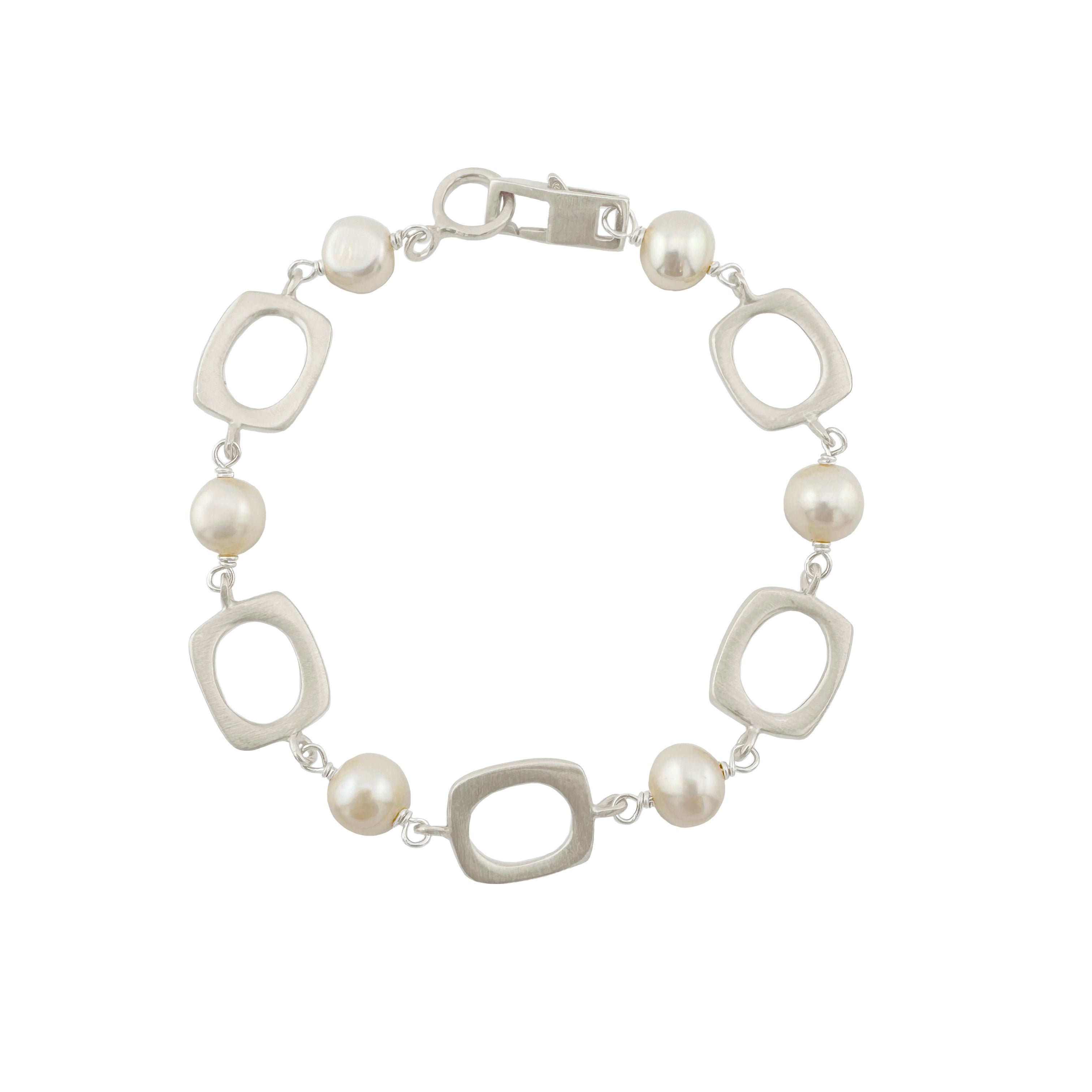Open rectangles with pearls bracelet in silver or vemeil. Bracelet is 7 1/2" long and 1/4" wide. Item# 192-02sb/vb. Our vermeil is sterling silver dipped in 16k gold. Findings are sterling silver and 14k gold fill. Handmade in Oakland, CA.