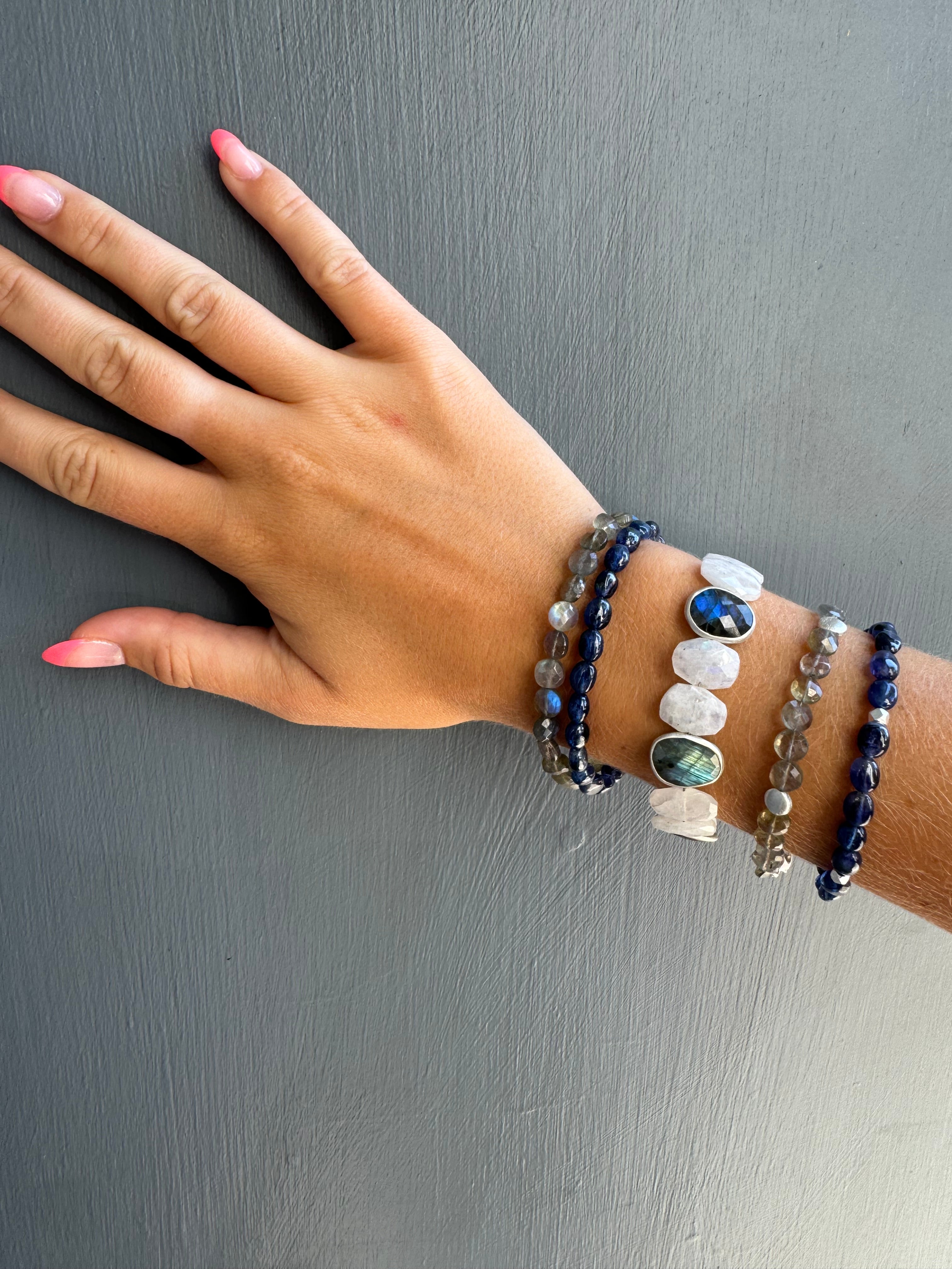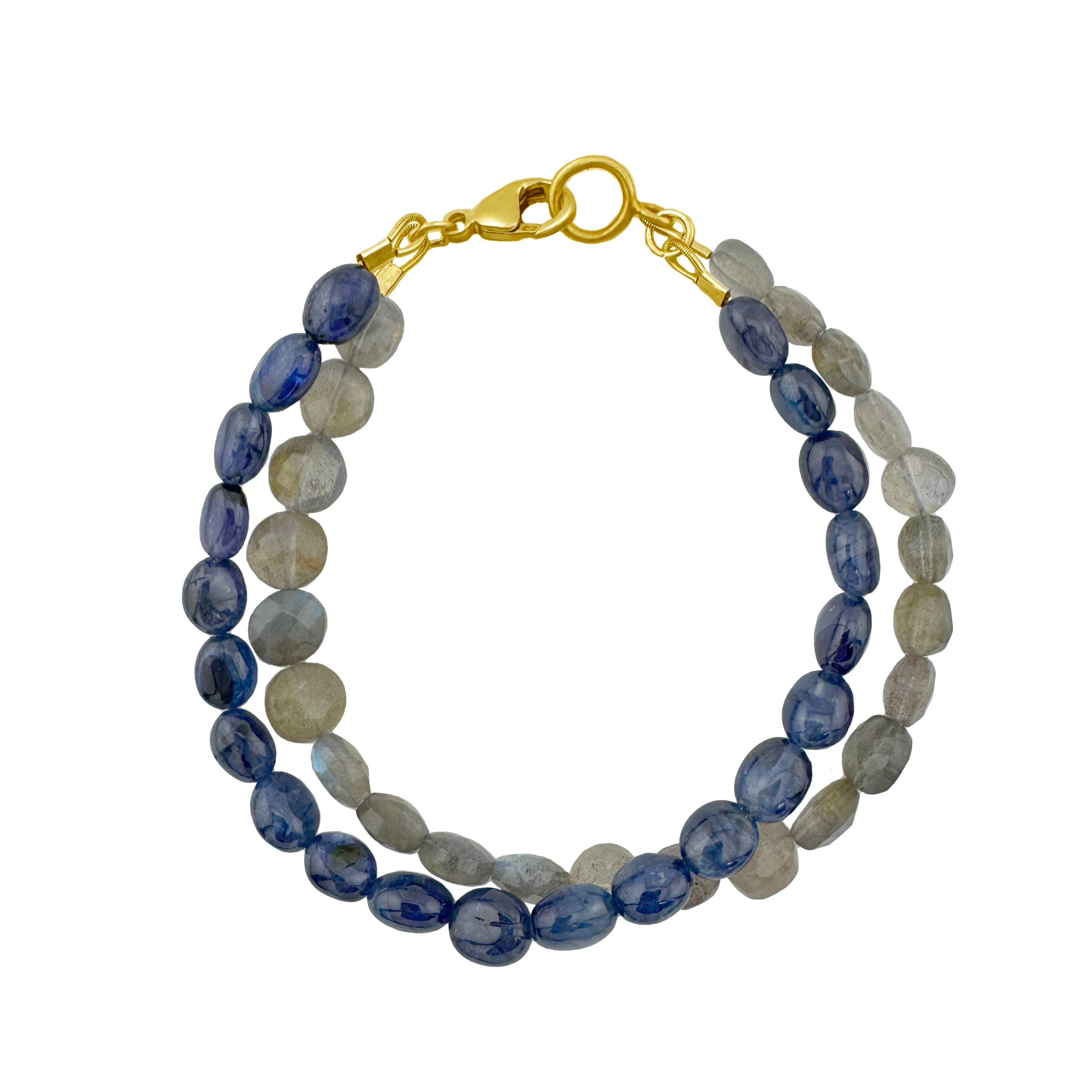 sapphire & labradorite double bracelet in silver or vermeil by Philippa Roberts. Bracelet measures approx. 7 1/2" long. Item# 191-25 sb/vb. Our vermeil is sterling silver dipped in 16k gold. Findings are sterling silver and 14k gold fill. Handmade in Oakland, CA.