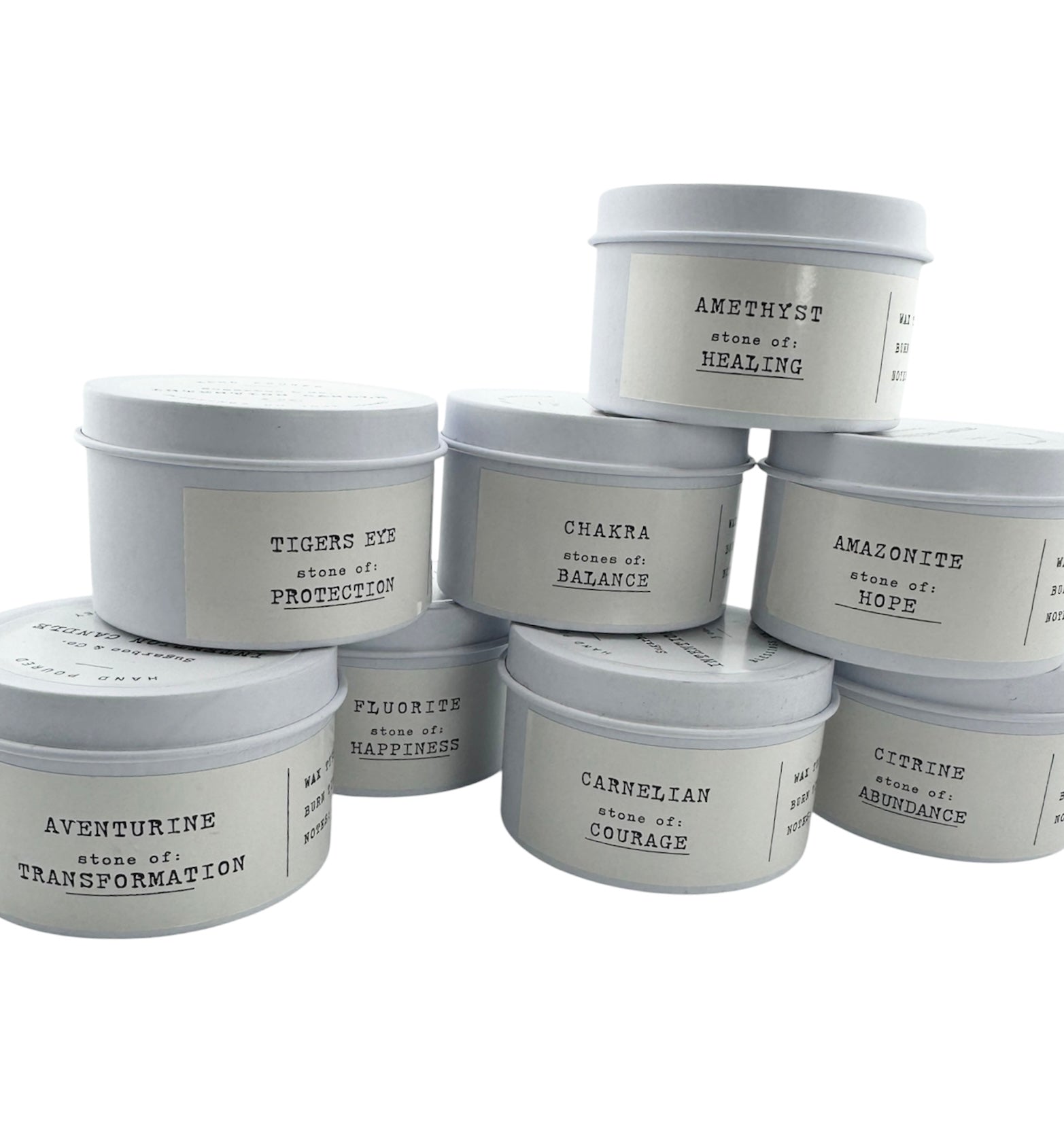 Ignite your mood with these delightful Intention Candles by Sugarboo. Each 3oz candle pairs a unique stone to match your chosen intention, adding a little magic to your space. Infused with Signature Sugarboo & Co. scent—fresh notes of grass and zesty grapefruit—these candles bring light and joy, burning for approximately 15 hours, with stones imbedded in the candles.  Brighten your days and set your vibe with every flicker!