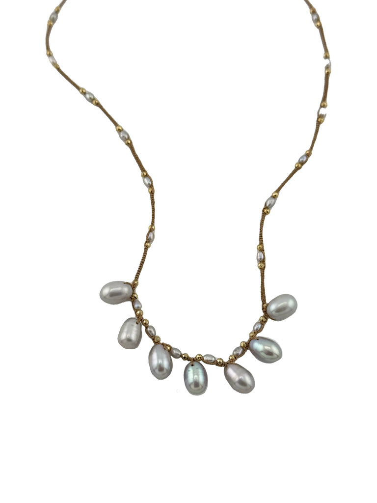 Silver Pearls on Tan Silk Cord Necklace