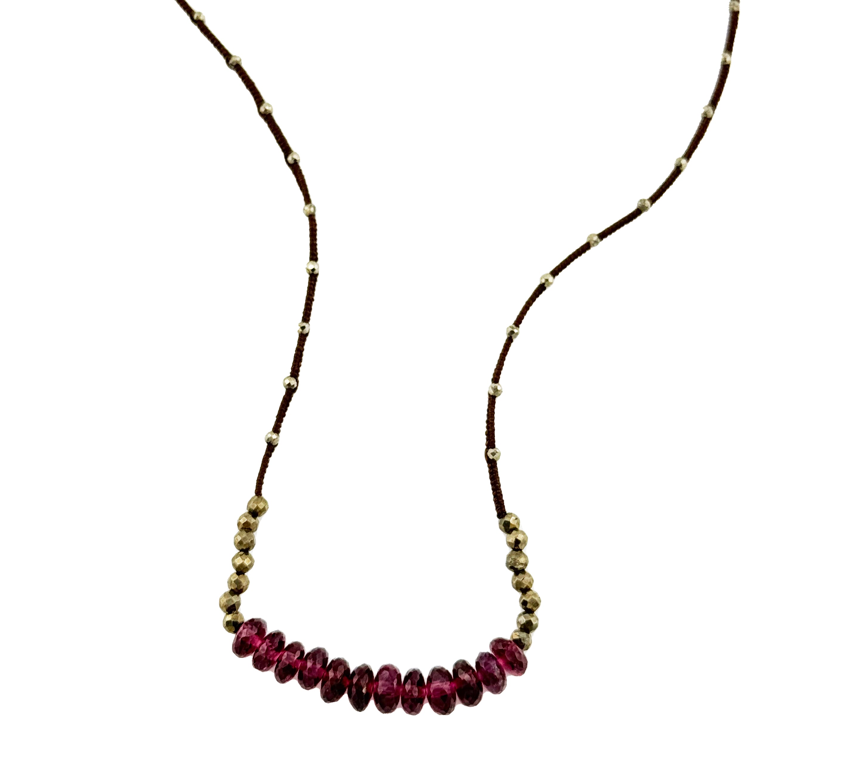 This stunning necklace from Danielle Welmond features skinny center garnet stones framed with pyrite beads woven into dark brown silk cord.