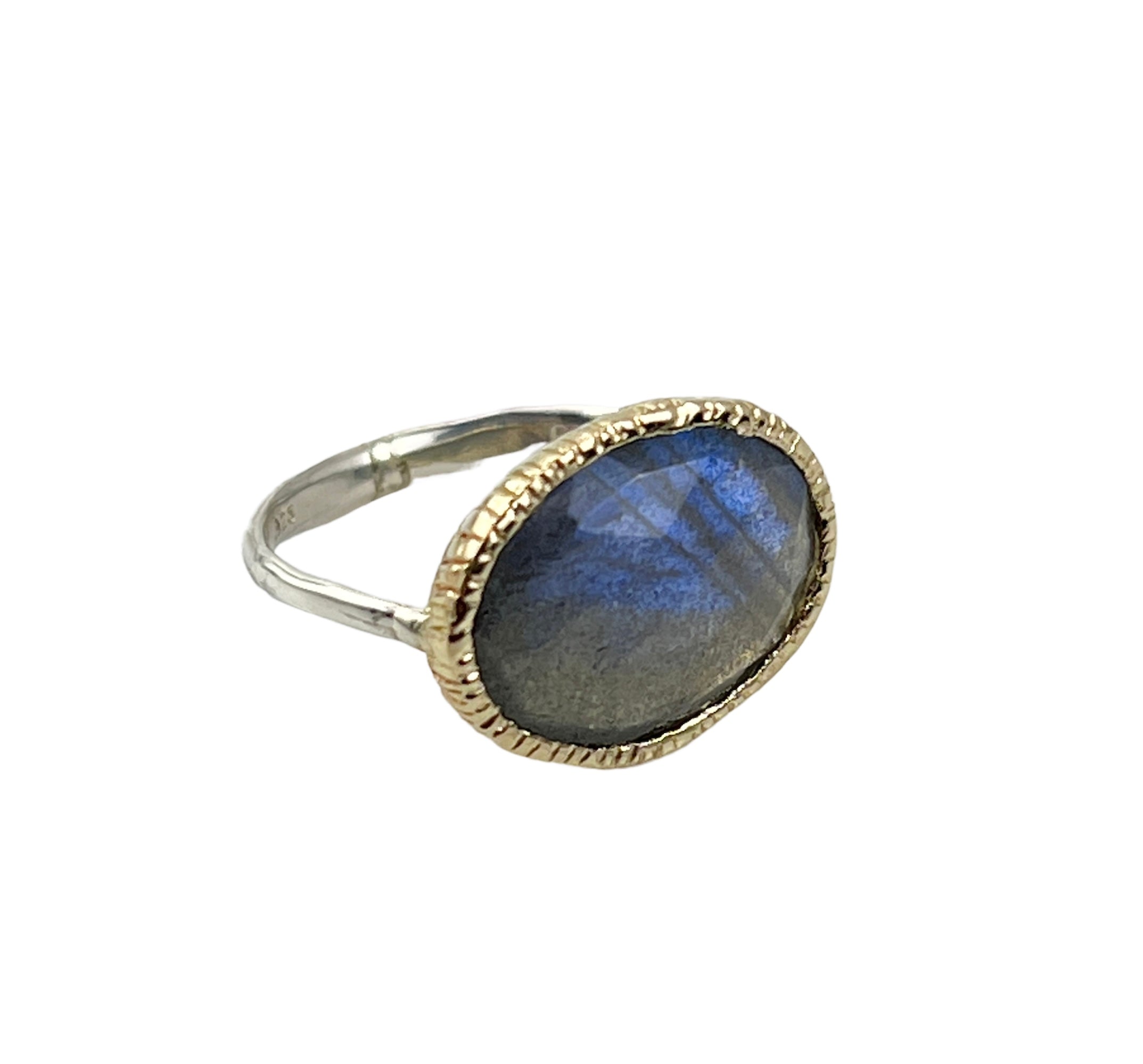 Danielle Welmond's gorgeous oval labradorite ring features a hammered sterling silver band with a rough textured 14k yellow gold setting.
