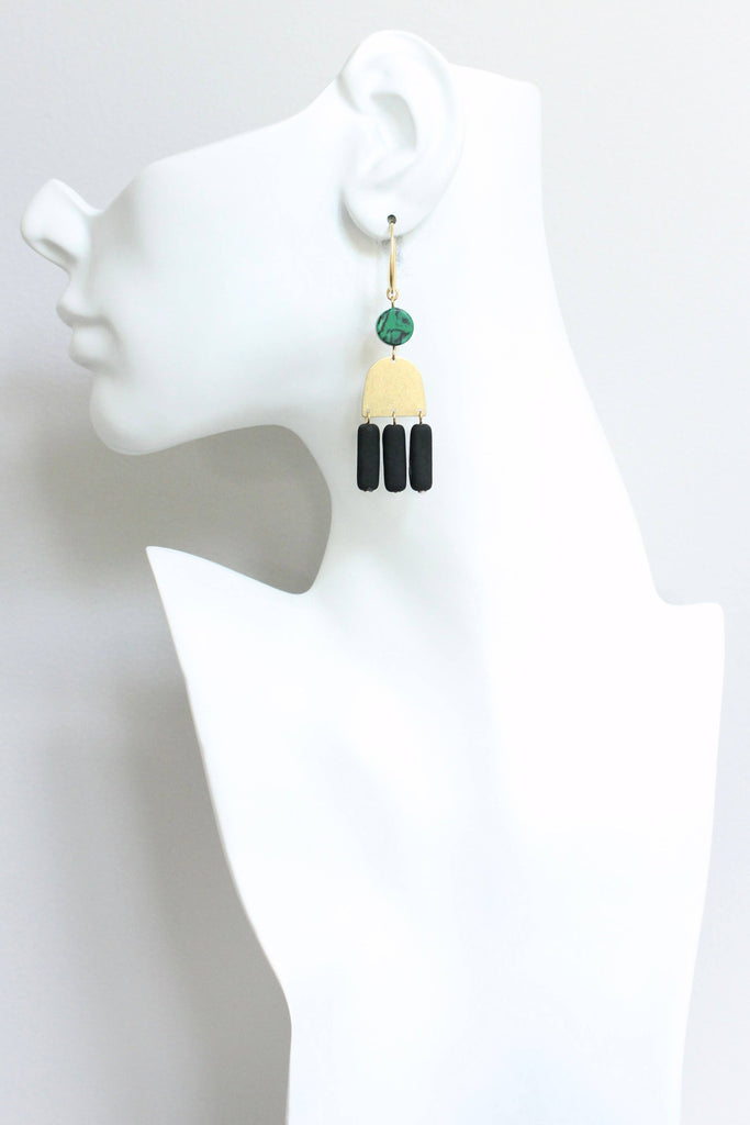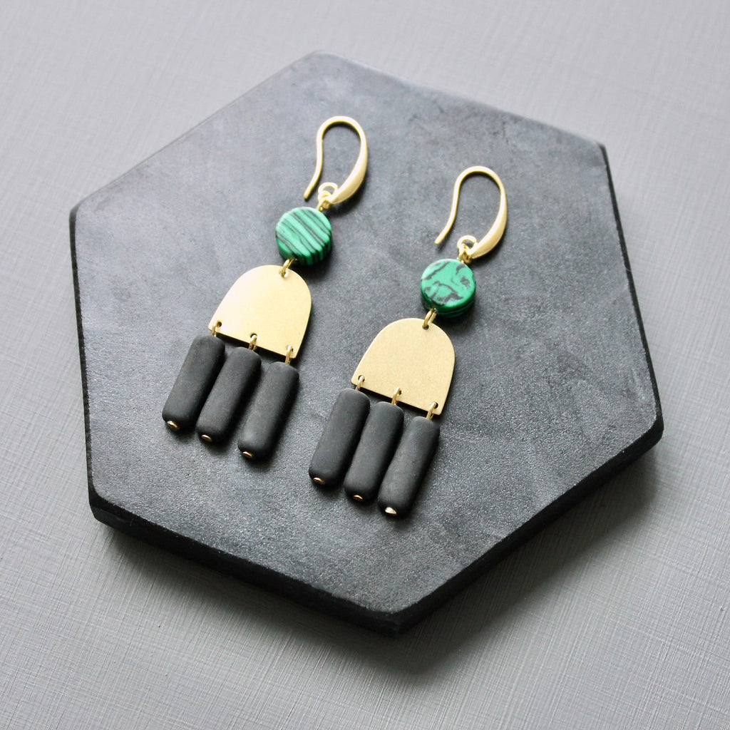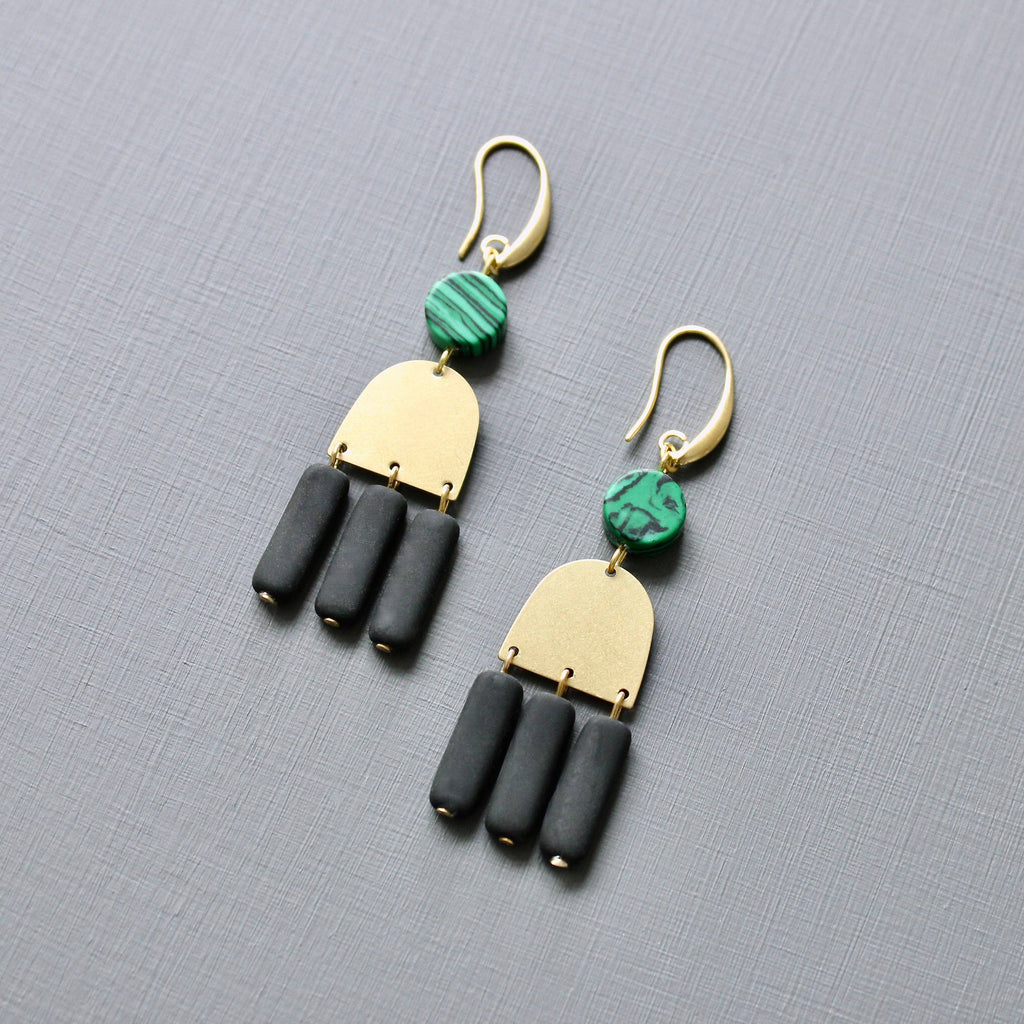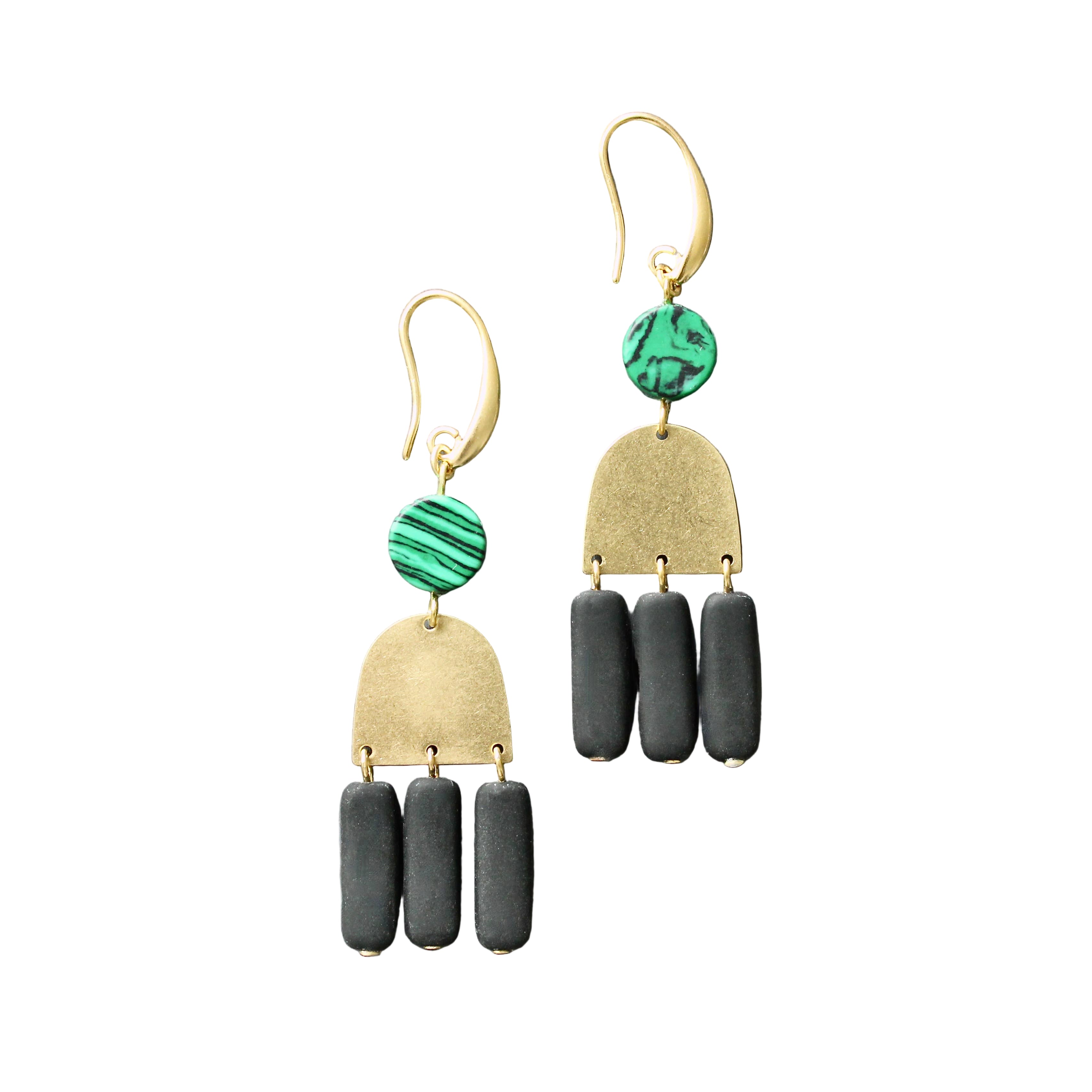 David Aubrey's Malachite and Black Glass Earrings exude a bold, yet refined aesthetic. Designed with 18k gold-plated brass hooks, they feature a striking combination of synthetic malachite and matte black glass, creating a captivating contrast that enhances their elegance. Each earring weighs just 0.165 oz., offering a lightweight feel while making a statement. With a drop length of 2.75 inches, these earrings are the perfect balance of contemporary style and natural beauty, making them an eye-catching addition to any outfit, day or night.
