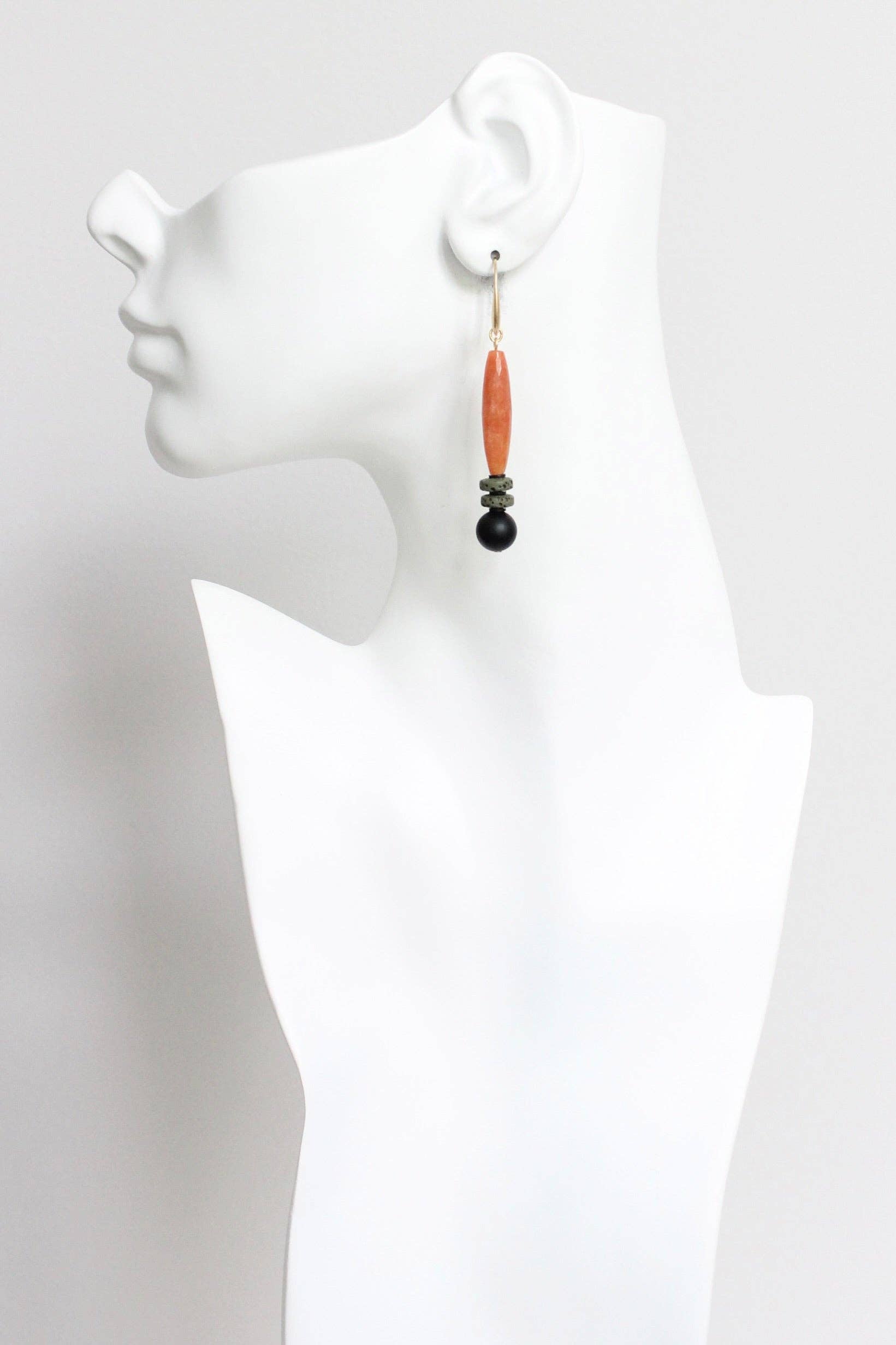 Rich in earthy tones and textures, David Aubrey's gold-plated brass hook earrings showcase a striking trio of beads—warm Carnelian jade, rugged moss lava, and glossy jet glass. The unique combination creates a balanced contrast of natural and polished elements, offering a bold yet grounded accessory for any look.