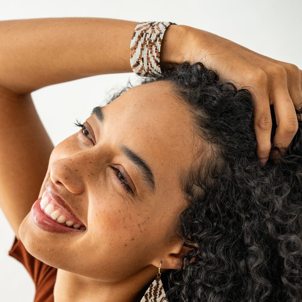 Zebra: always a classic. Hand-beaded in bold black and white. Stretch fit, easy wear. Stands out solo or pairs perfectly with brass