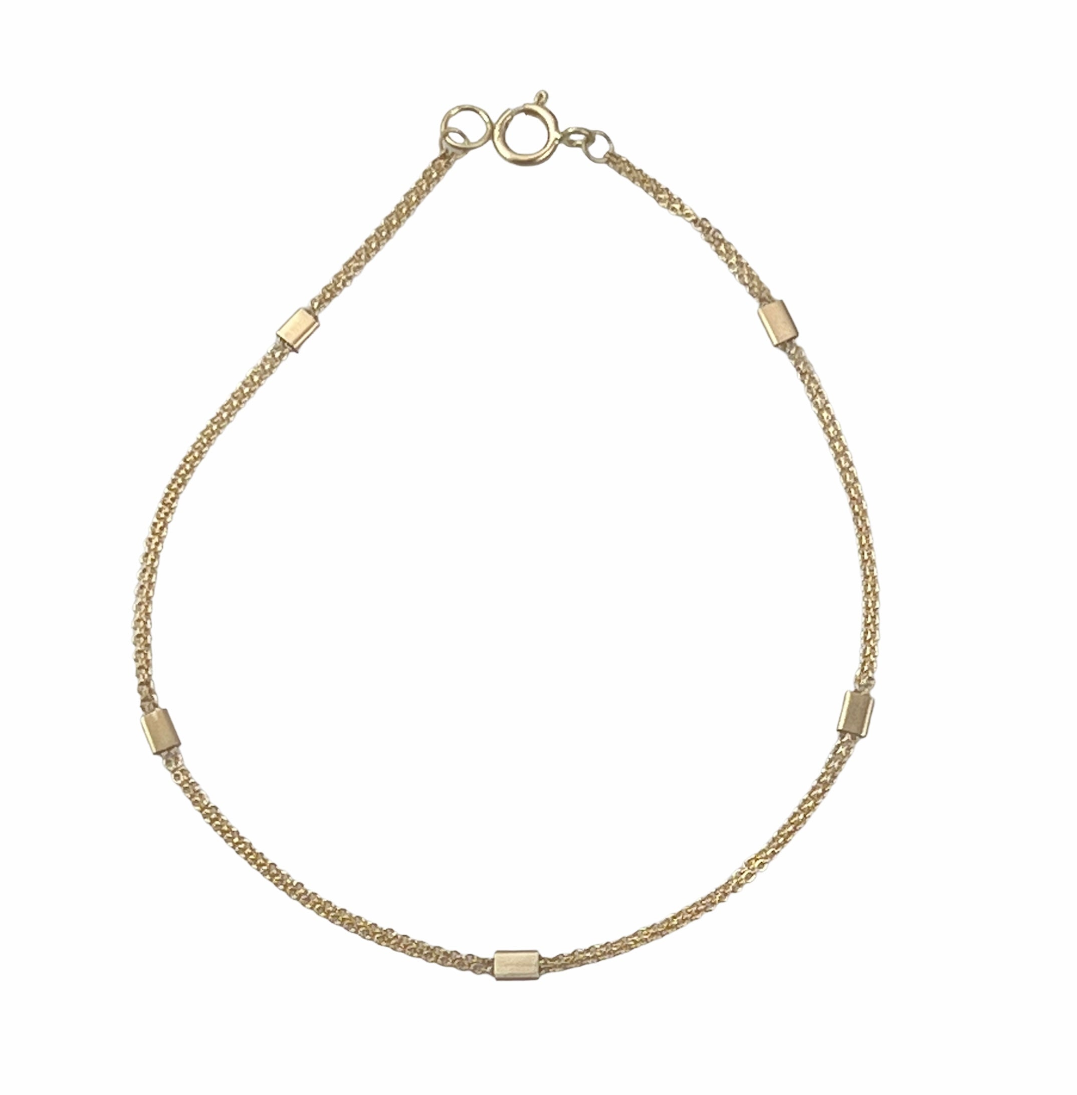 Simplicity of form and space, this bracelet from Carla Caruso interlaces two strands of 14k cable chain with gold tabs. Handmade with a satin finish, measures 7” in length and fastens with a spring clasp.
