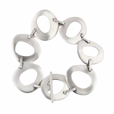 Organic cut-out circle link bracelet in brushed silver. Each link is approximately 1" in diameter.