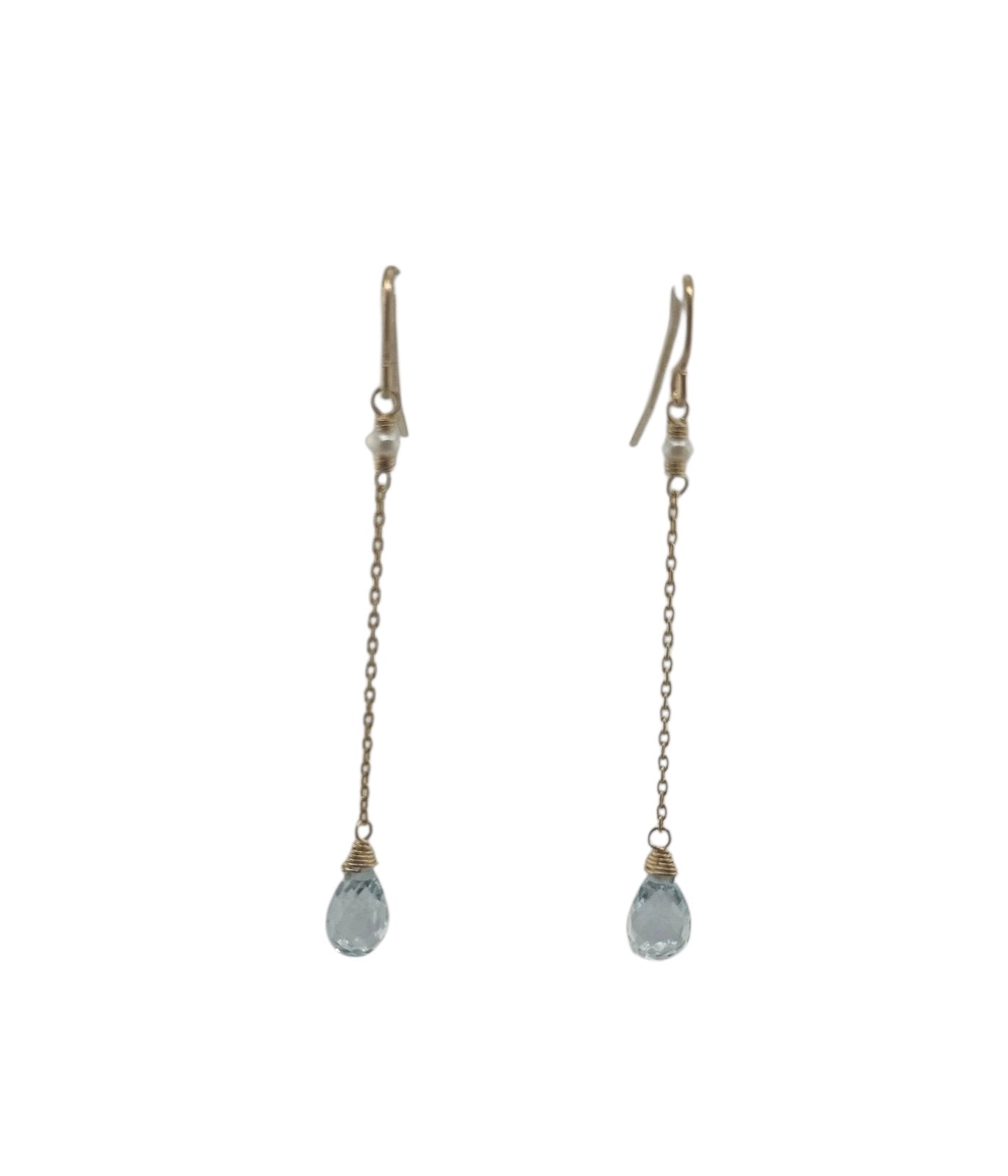 Multifaceted blue topaz drops from a thin gold chain with pearl accent.
