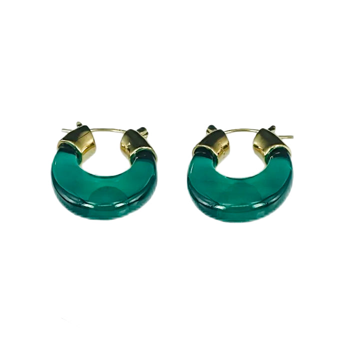 Bold meets playful in Lucas Jack's emerald green resin hoops. With their sculptural elongated shape and glossy finish, they channel a fresh, modern vibe that pops with personality. Each pair is accented with 18k gold-plated end caps for a refined touch that elevates the fun.