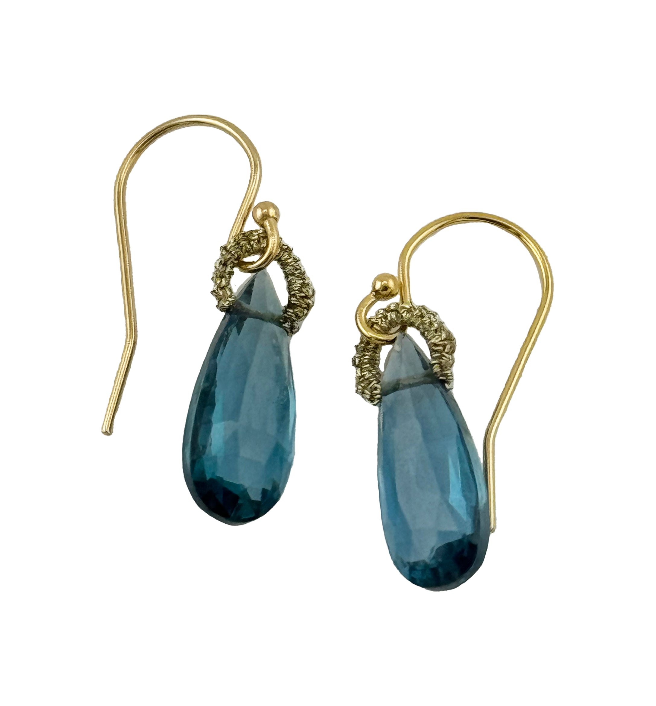 Indulge in luxury with these London Blue Quartz Drop Earrings by Danielle Welmond. The stunning blue quartz drops are topped with meticulously hand-woven gold cord, creating a piece of art for your ears. Elevate any outfit with these exclusive and sophisticated earrings.