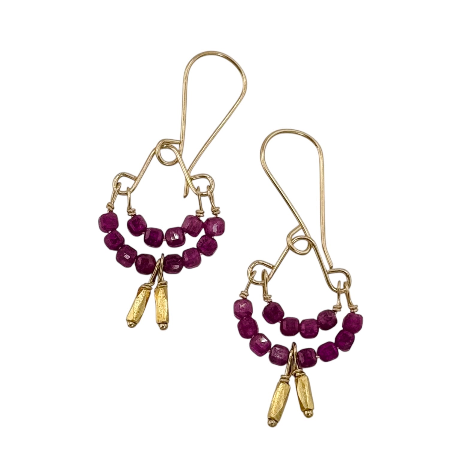 Playful yet refined, Debbie Fisher's lightweight earrings feature rich ruby beads and vermeil accents, artfully arranged in a pair of hanging double arches. Suspended from gold-filled ear wires, they offer graceful movement and a fresh pop of color—perfect for brightening up everyday looks or adding a subtle statement to evening wear.