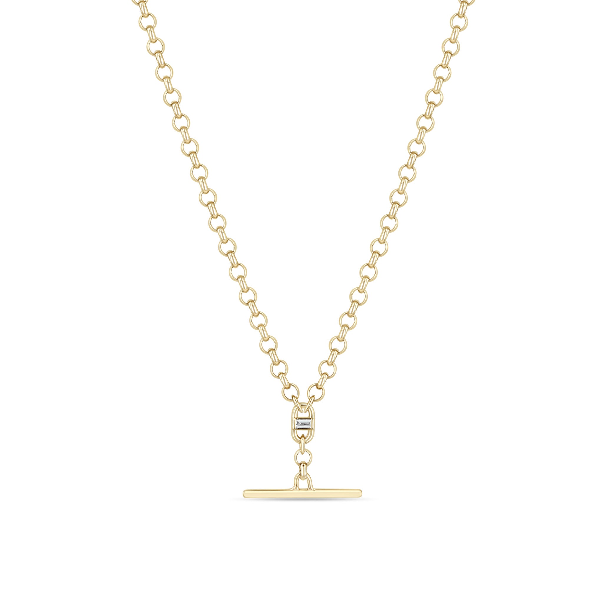 Elevate your elegance with this 14K Pavé Diamond Circle & Bar Toggle Necklace, a stunning piece that combines luxurious design with modern sophistication. The necklace features a delicate medium circle chain, with a beautiful baguette diamond set on an open link drop, and finished with a faux toggle lariat. The interplay of diamonds and the geometric design adds a perfect touch of sparkle and refinement.