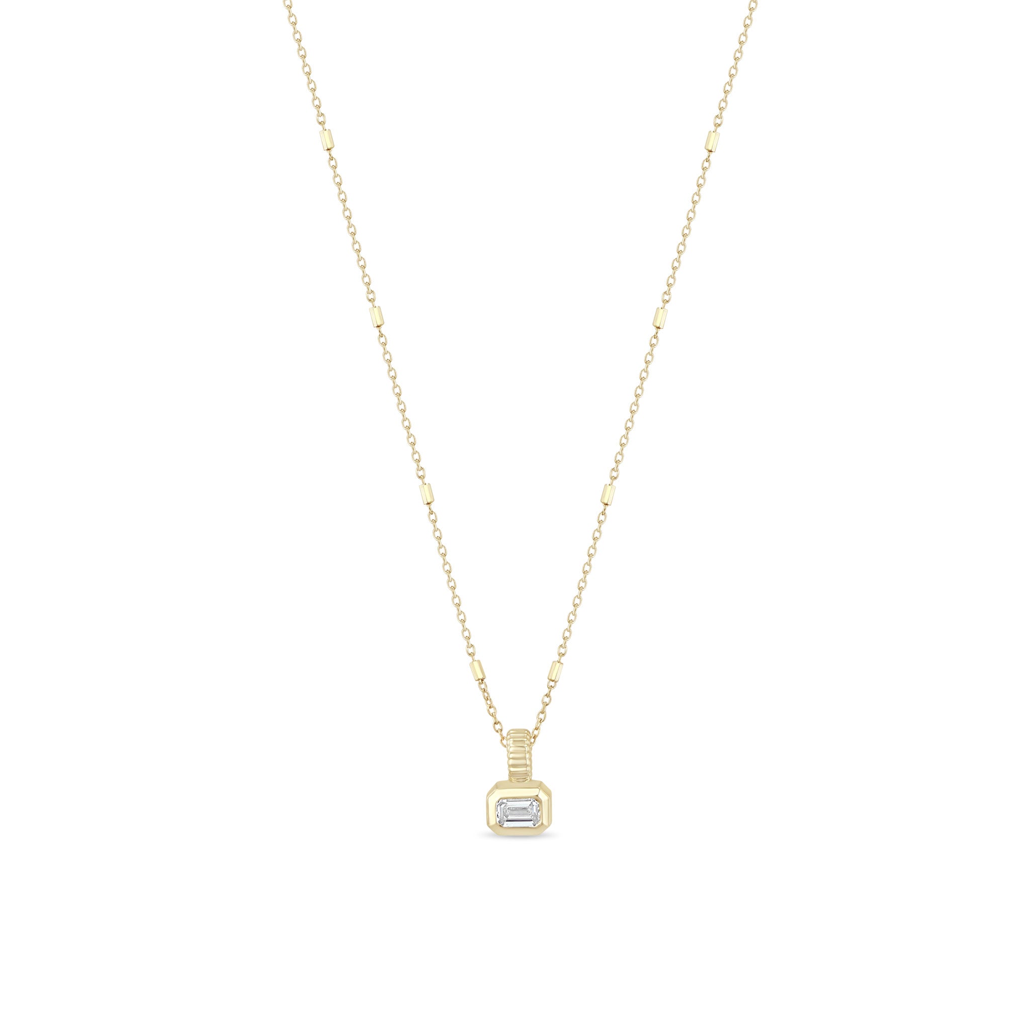 Elevate your elegance with this 14K Bezel Set Diamond on Bar & Cable Chain Necklace, a stunning piece that combines luxurious design with modern sophistication. The necklace features a delicate bar & cable chain, with a beautiful bezel-set, emerald cut diamond set on a corrugated bead bail. The interplay of diamonds and the geometric design adds a perfect touch of sparkle and refinement.