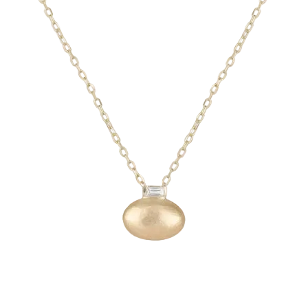 This pendant combines an elongated oval of solid, satin-finished 14k gold with a single, sleek diamond baguette. At 16”, this necklace is ready to be layered or shine on its own.