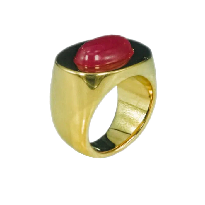 The wide gold band gleams with a mirror-like polish, framing a vibrant pink quartz that glows with subtle transparency. Its domed surface catches light gently, radiating fun and fashion. The contrast between the ring’s strong silhouette and the stone’s hue creates a look that’s both powerful and poetic.