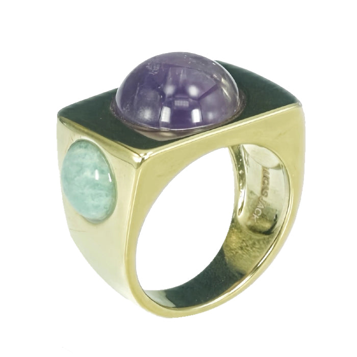 Set atop a substantial, high-shine gold band from Lucas Jack, a amethyst stone is flanked on either side by amazonite -- the trio of smooth cabochon stones creates a harmonious play of color. Their polished surfaces catch the light beautifully, while the ring’s bold design is sure to catch attention.
