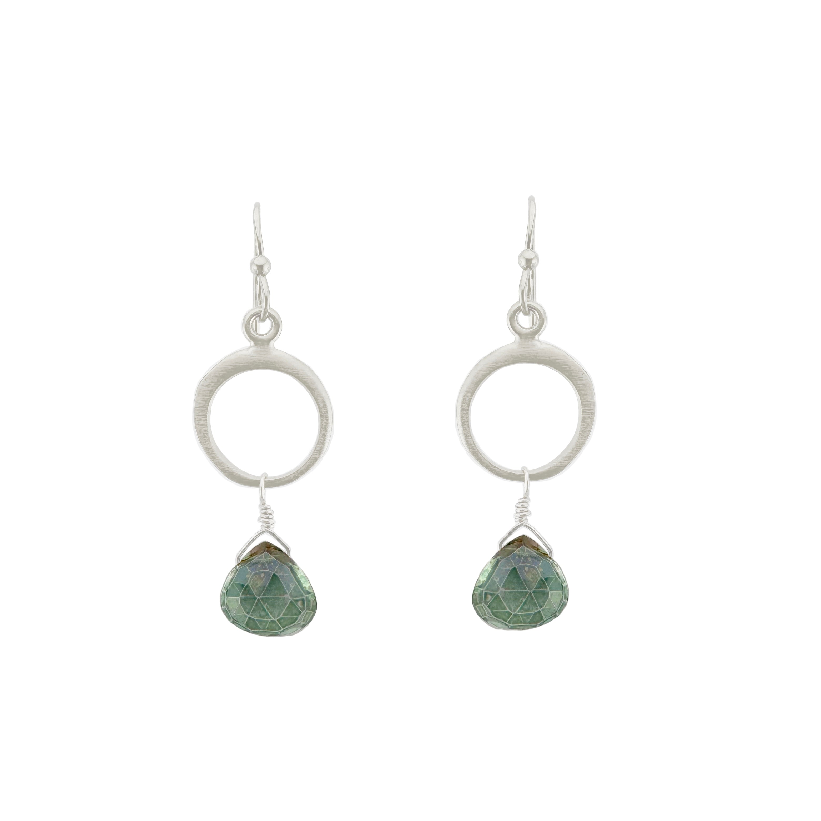 Circle with mystic quartz earrings in silver or vermeil. Earrings hang 1 1/2" long on balled earwires. Item# 193-00se/ve. Our vermeil is sterling silver dipped in 16k gold. Findings are sterling silver and 14k gold fill. Handmade in Oakland, CA.