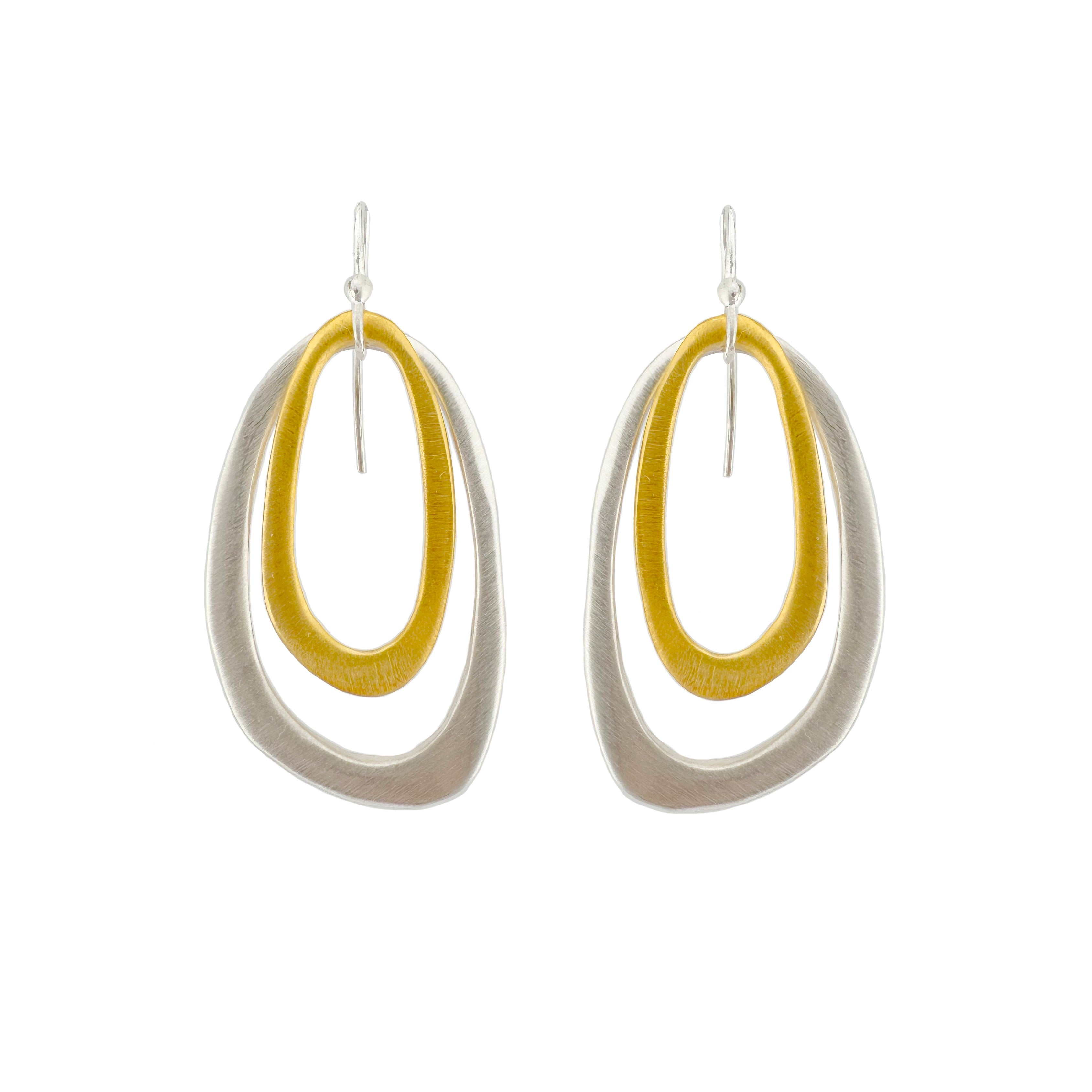 double oval earrings in silver, vermeil, or mixed by Philippa Roberts. Earrings hang approx. 1 1/2". Item# 190-16 se/ve/e. Our vermeil is sterling silver dipped in 16k gold. Findings are sterling silver and 14k gold fill. Handmade in Oakland, CA.