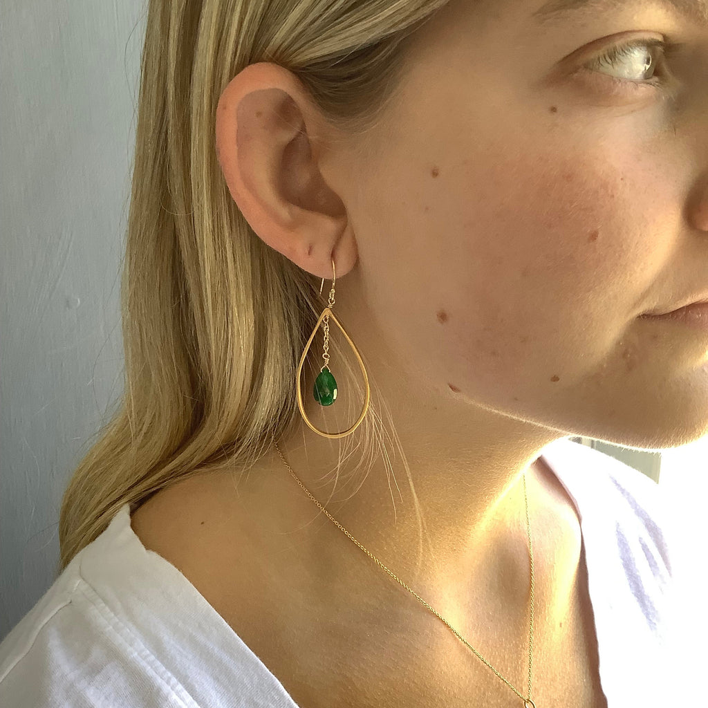 Drop with emerald earrings in silver or vermeil by Philippa Roberts. earrings hang approx. 2 1/4". Item #181-02se/ve Our vermeil is sterling silver dipped in 16k gold. Findings are sterling silver and 14k gold fill. Handmade in Oakland, CA.