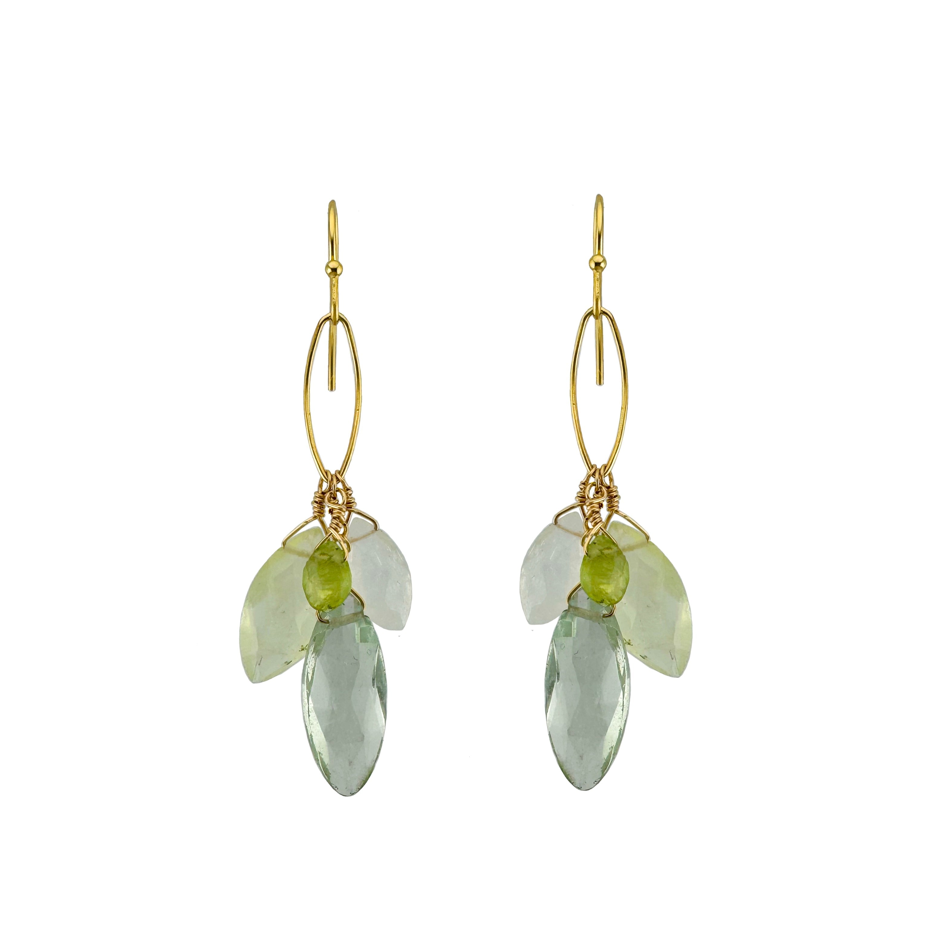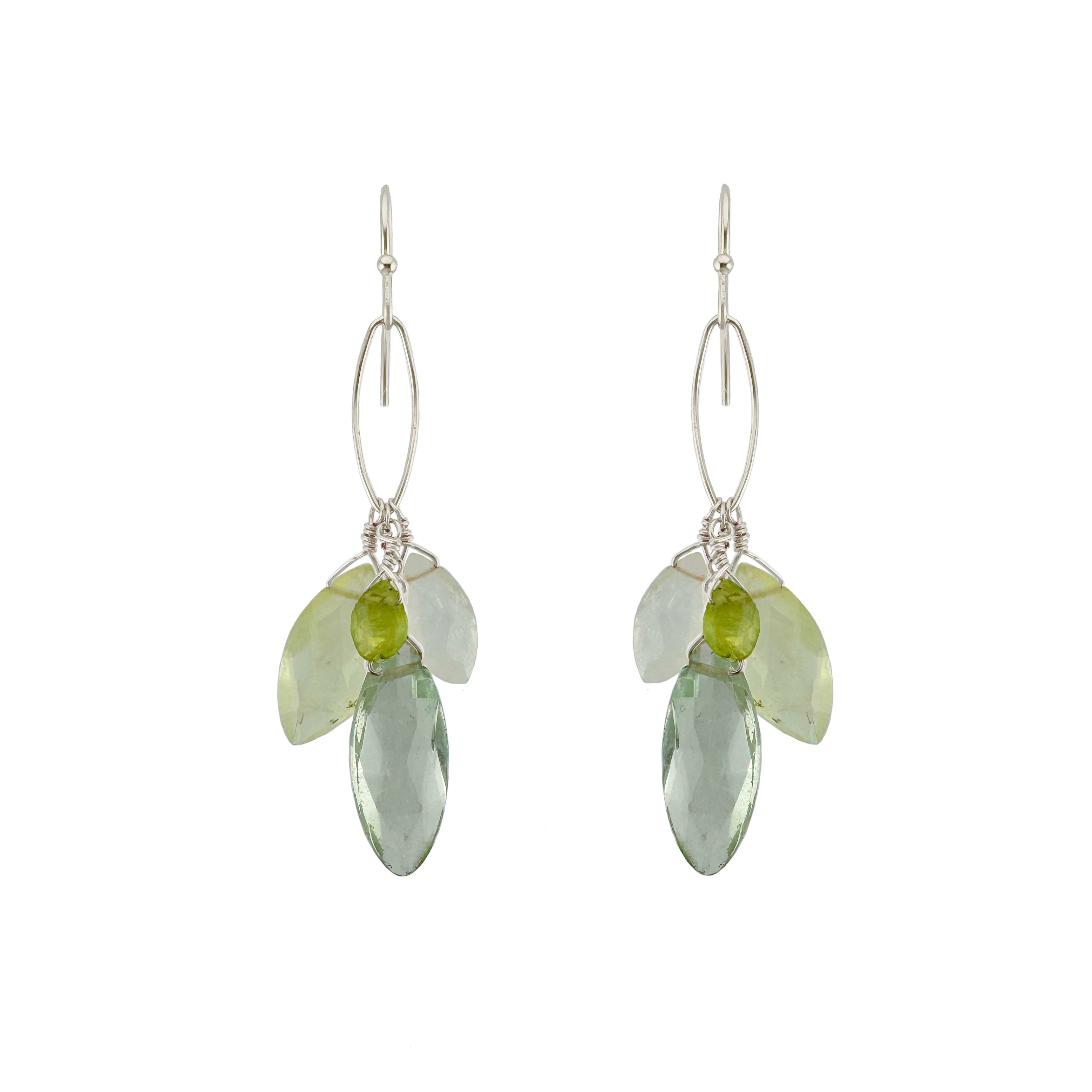 Green amethyst, prehnite, moonstone, peridot cluster earrings in silver or vermeil. Earrings hang 2 1/4" long on balled earwires. Item# 192-20se/ve. Our vermeil is sterling silver dipped in 16k gold. Findings are sterling silver and 14k gold fill. Handmade in Oakland, CA.