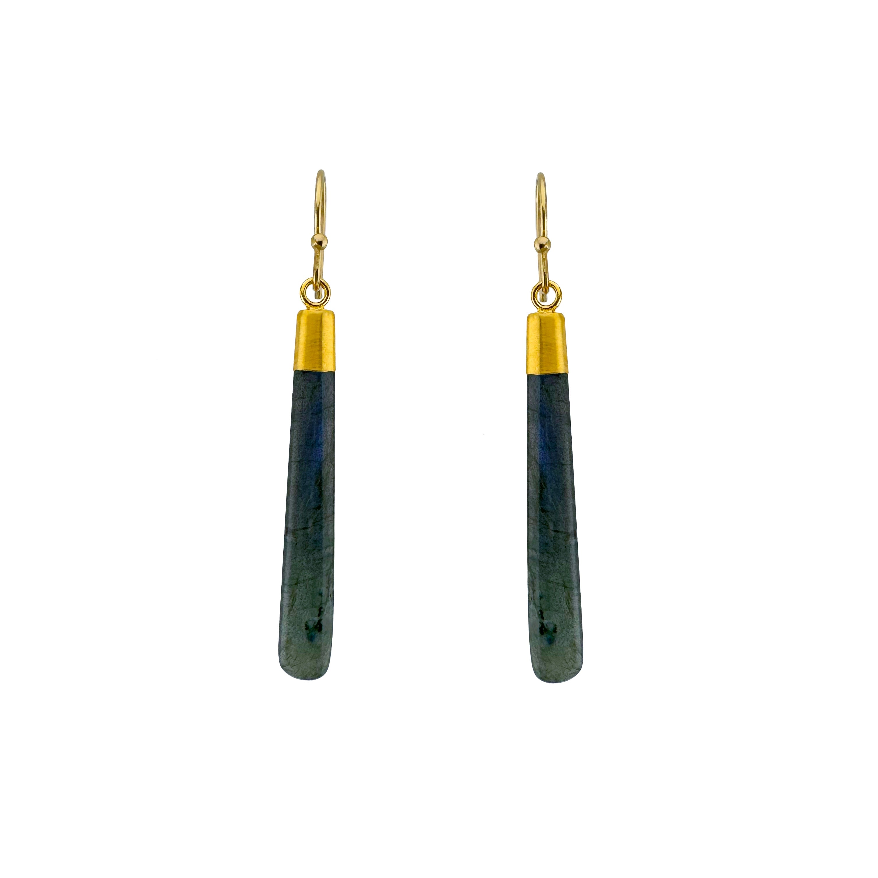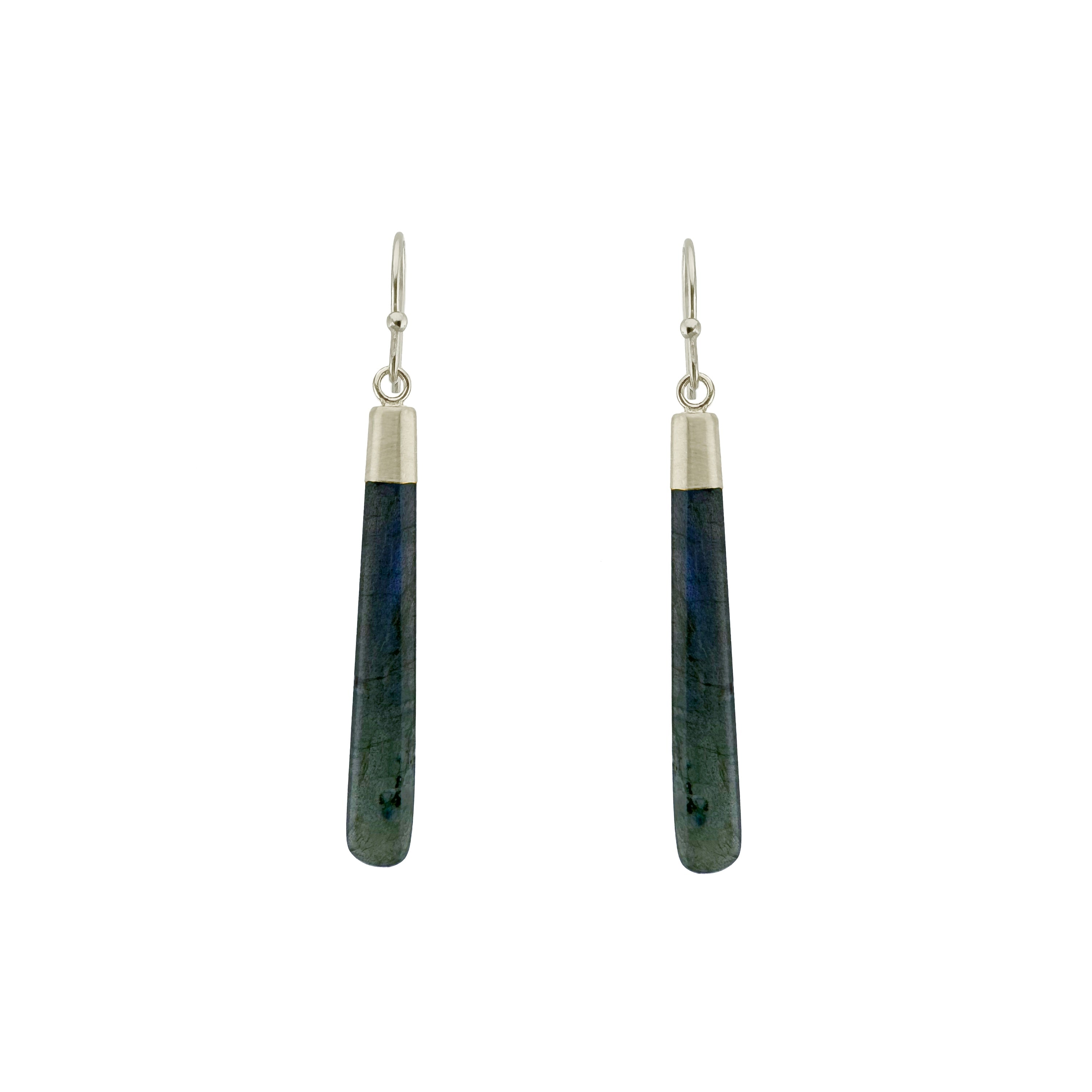 Long labradorite earrings in silver or vermeil. Earrings hang 2 1/4" on balled earwires. Item# 194-24se/ve. Our vermeil is sterling silver dipped in 16k gold. Findings are sterling silver and 14k gold fill. Handmade in Oakland, CA.