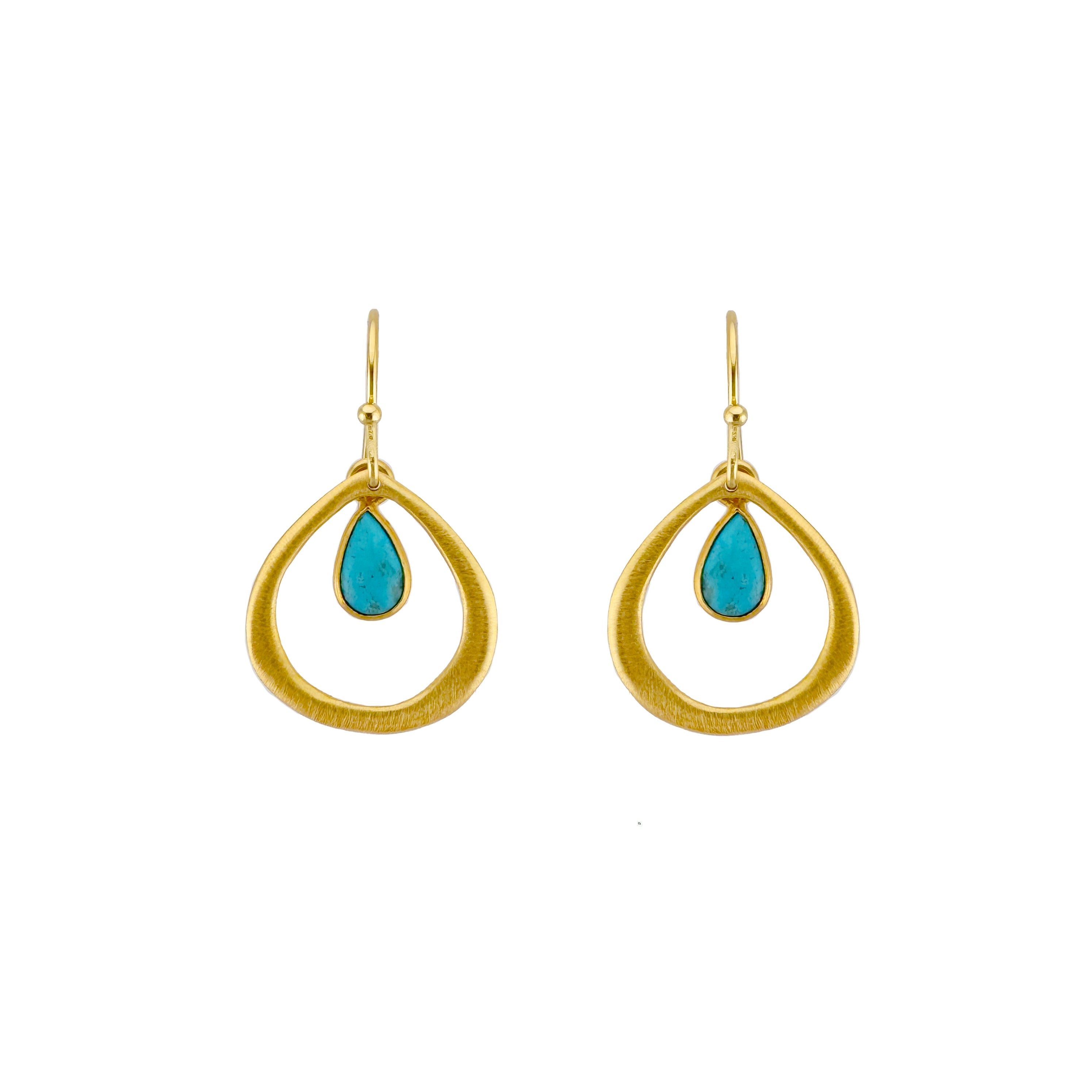 Open drop w. turquoise earrings in silver or vermeil. Earrings hang 1 1/4" on balled earwires. Item#194-18se/ve. Our vermeil is sterling silver dipped in 16k gold. Findings are sterling silver and 14k gold fill. Handmade in Oakland, CA.