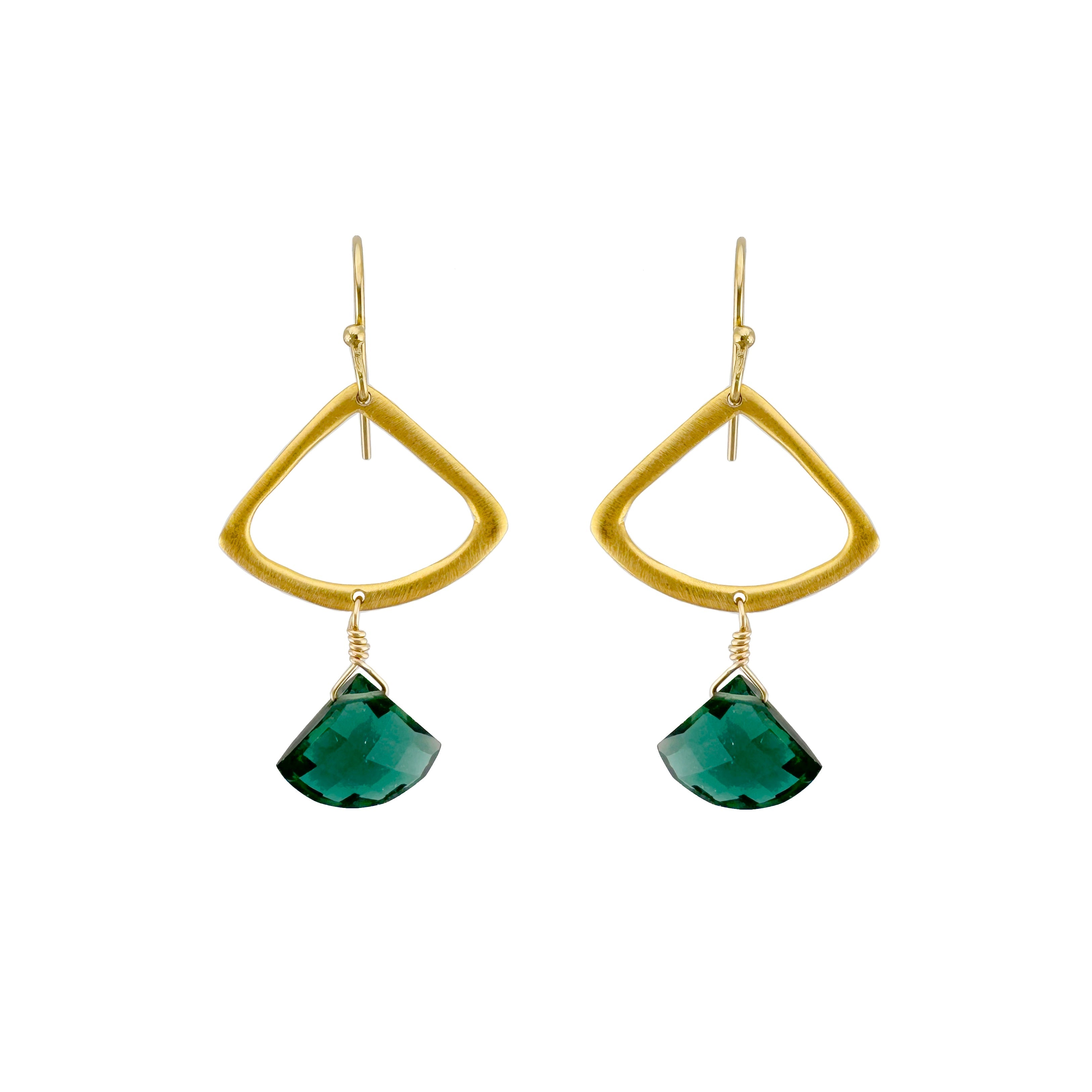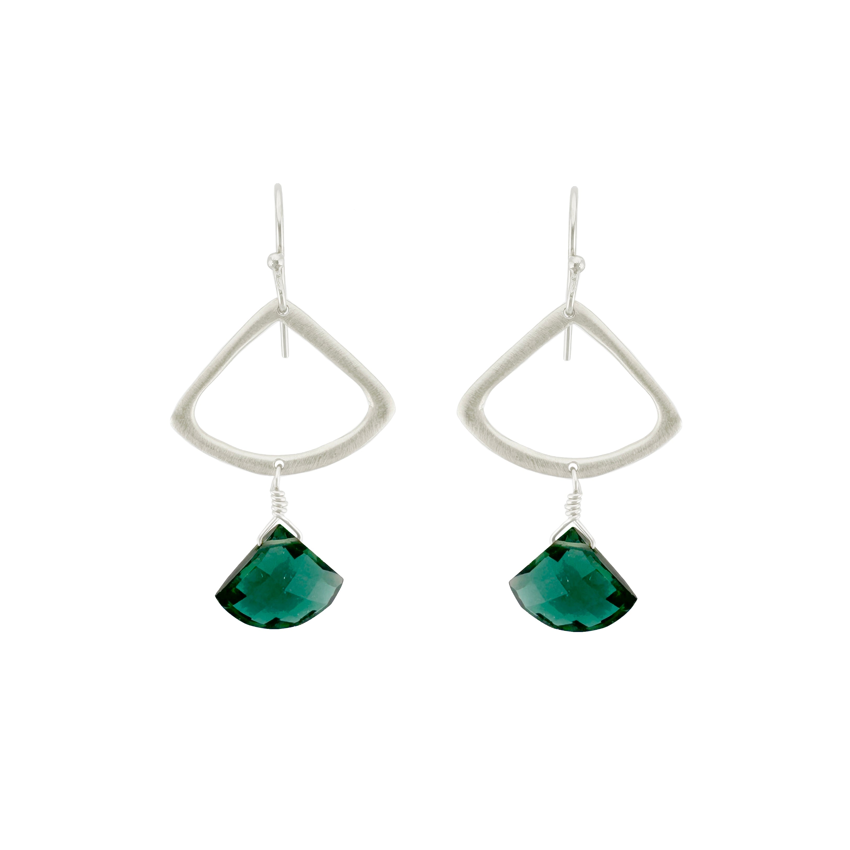 Open fan with indicolite earrings in silver or vermeil. Earrings hang 1 5/8" long on balled earwires. Item# 193-02se/ve. Our vermeil is sterling silver dipped in 16k gold. Findings are sterling silver and 14k gold fill. Handmade in Oakland, CA.