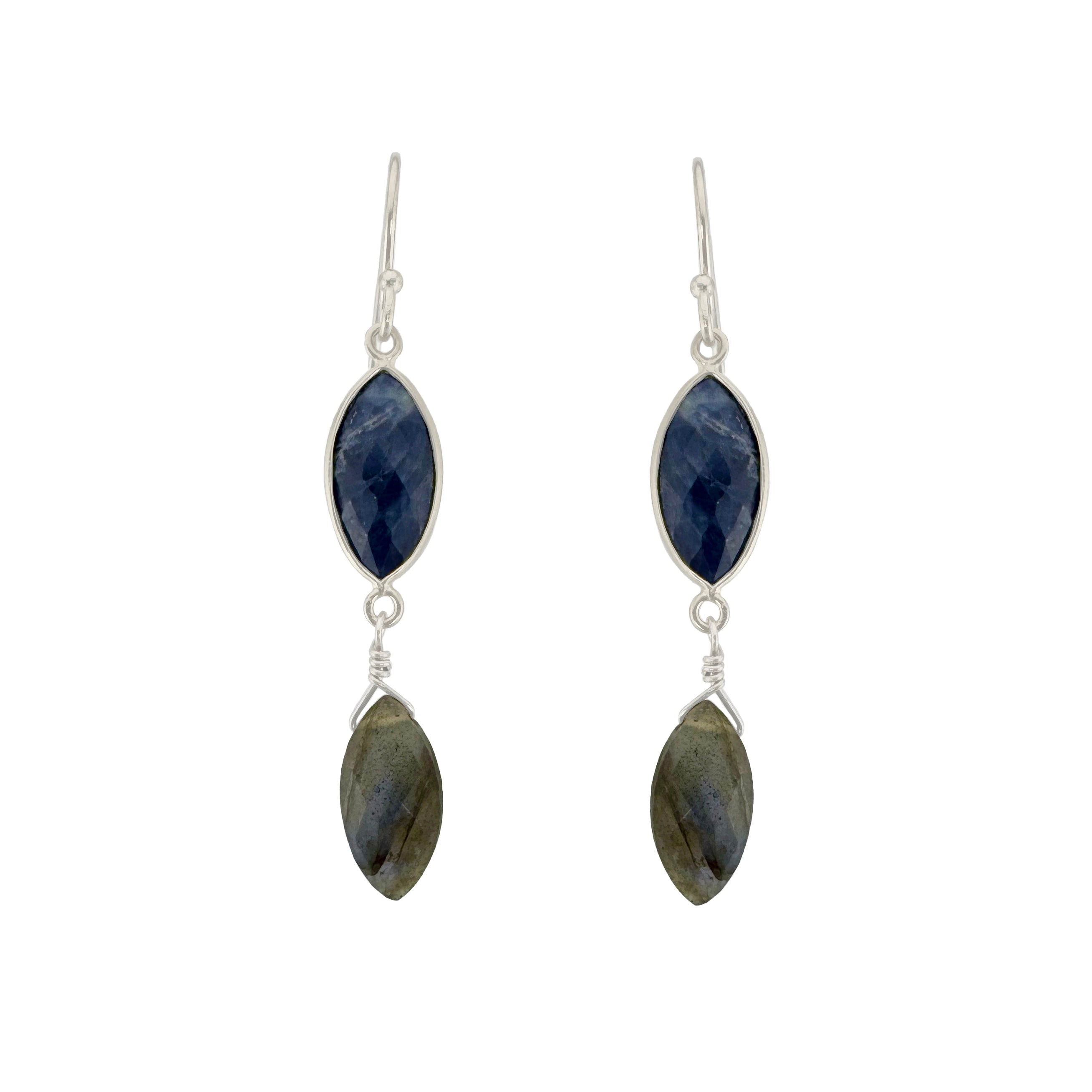 sapphire marquis w. labradorite earrings in silver or vermeil by Philippa Roberts. Earrings hang approx. 1 1/2". Item# 191-16 se/ve. Our vermeil is sterling silver dipped in 16k gold. Findings are sterling silver and 14k gold fill. Handmade in Oakland, CA.