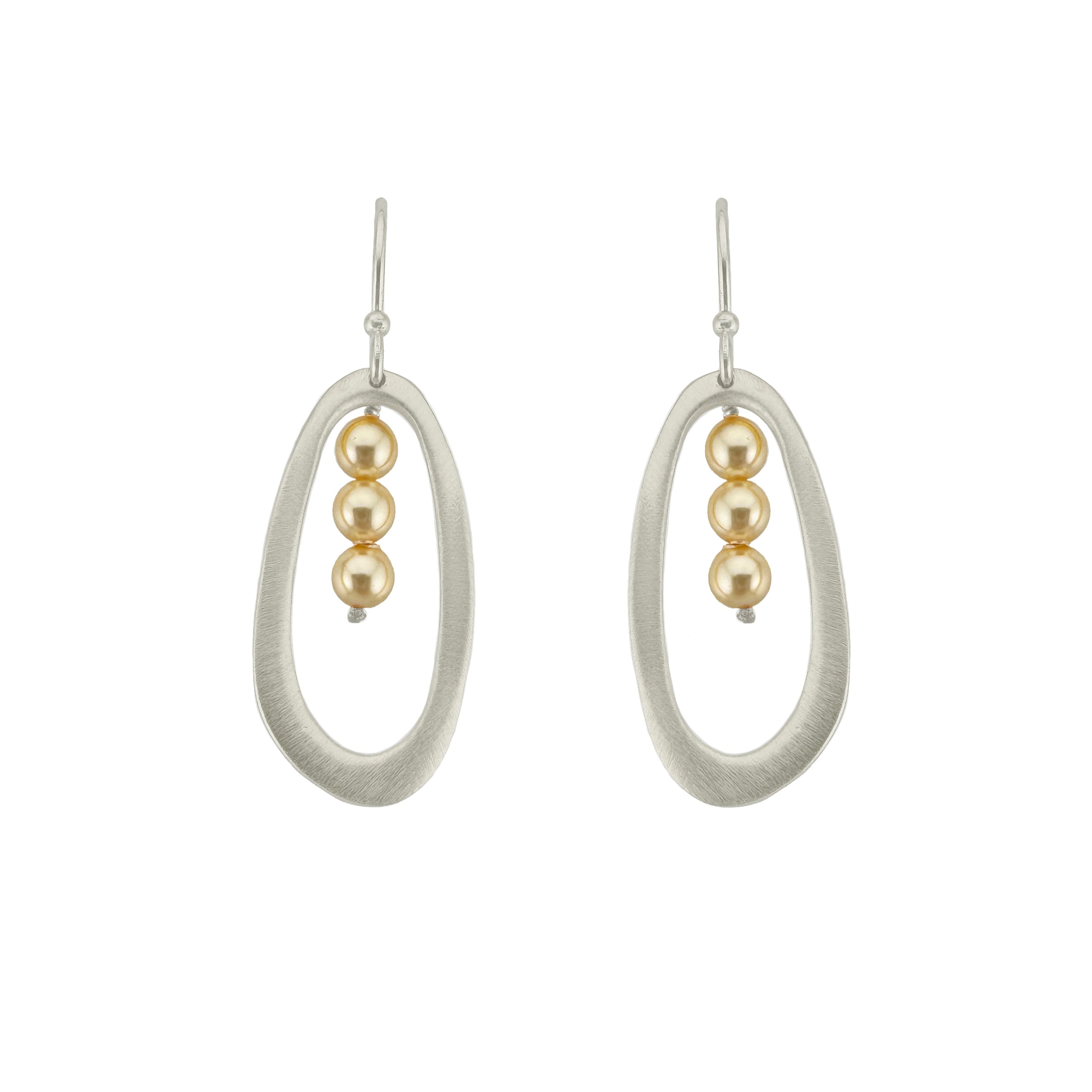 three pearls in oval earrings in silver or vermeil by Philippa Roberts. Earrings hang approx. 1". Item# 190-18 se/ve. Our vermeil is sterling silver dipped in 16k gold. Findings are sterling silver and 14k gold fill. Handmade in Oakland, CA.