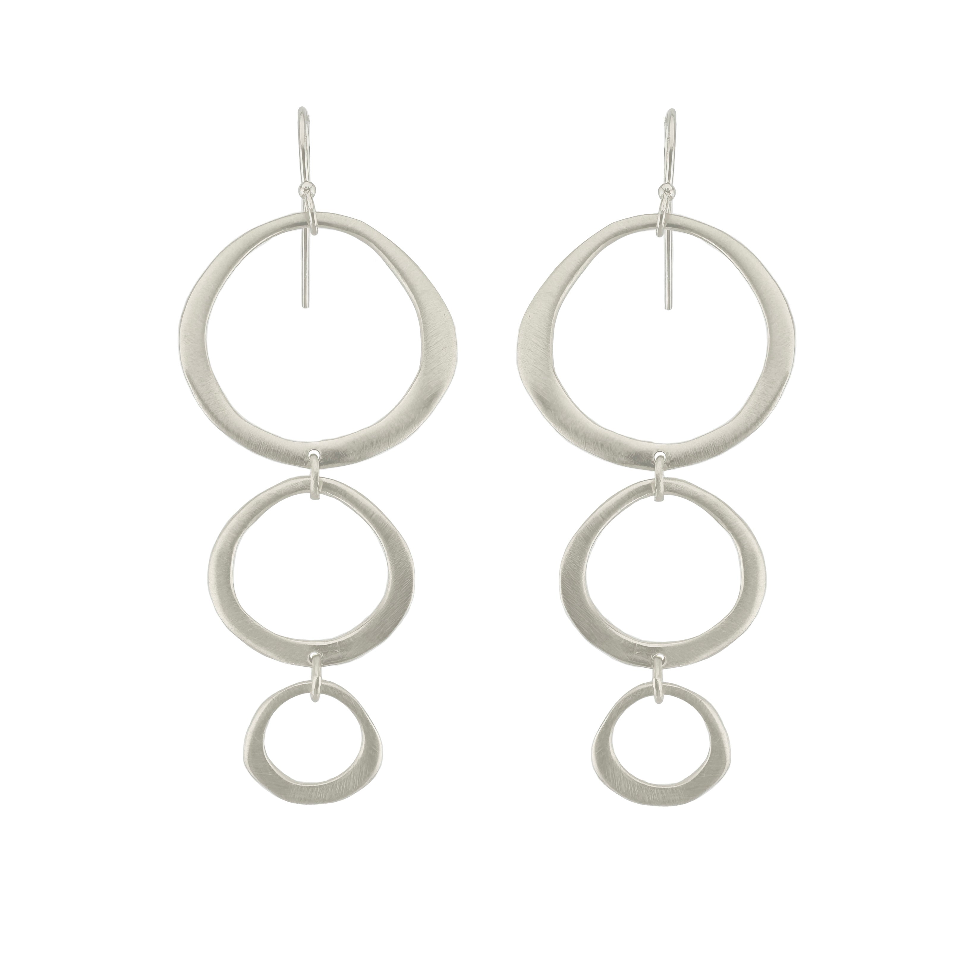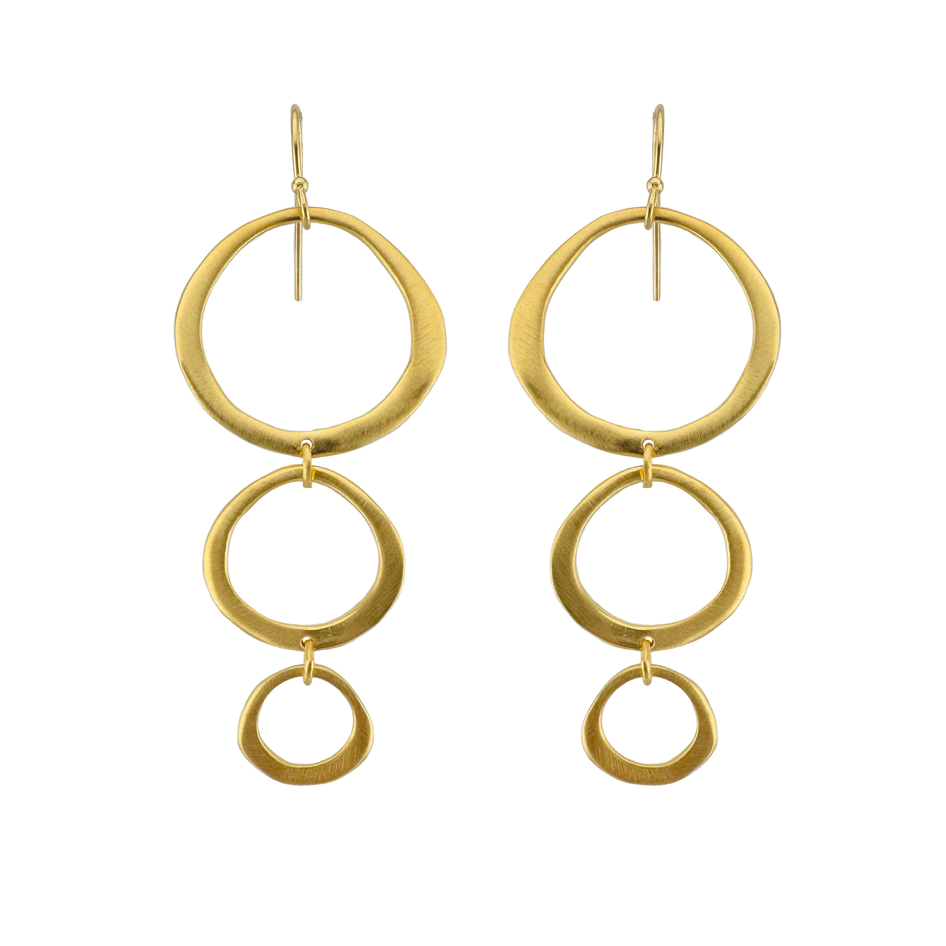 triple circle earrings in silver or vermeil. Earrings hang approx. 2 1/4". Item# 190-08 se/ve. Our vermeil is sterling silver dipped in 16k gold. Findings are sterling silver and 14k gold fill. Handmade in Oakland, CA.