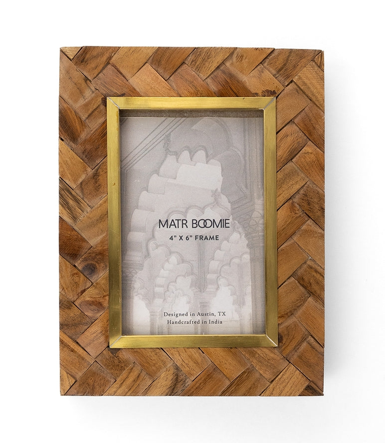 The Basu 4x6 Picture Frame features a hand-carved braided wood design with brass inlay, two-way easel back, and dual d-rings for flexible display. The picture frame accommodates a 4x6 photo or print, easily accessed with metal swivel tabs and removable back.
