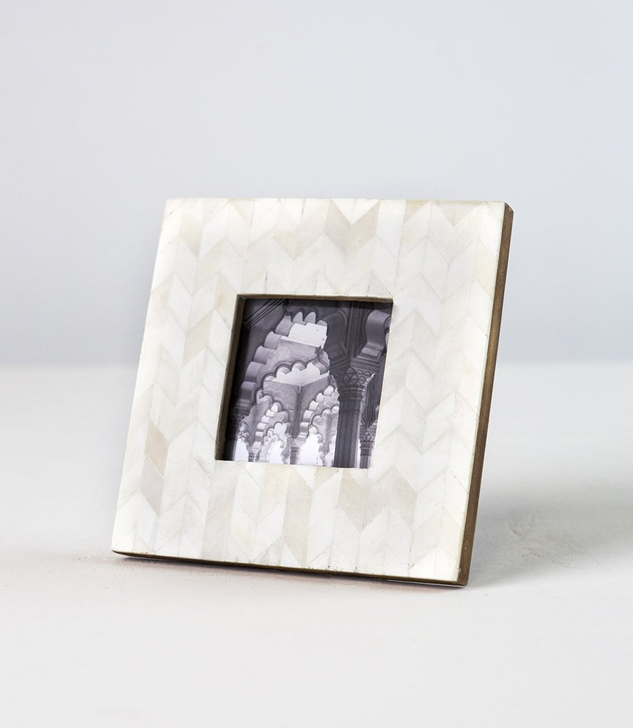 Display your most treasured memories in this handcrafted frame, featuring cruelty-free, ethically sourced bone tile in an inlaid chevron mosaic design.