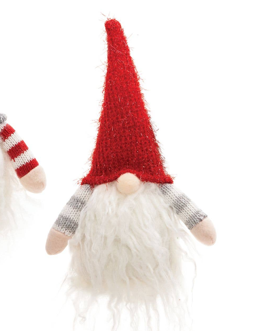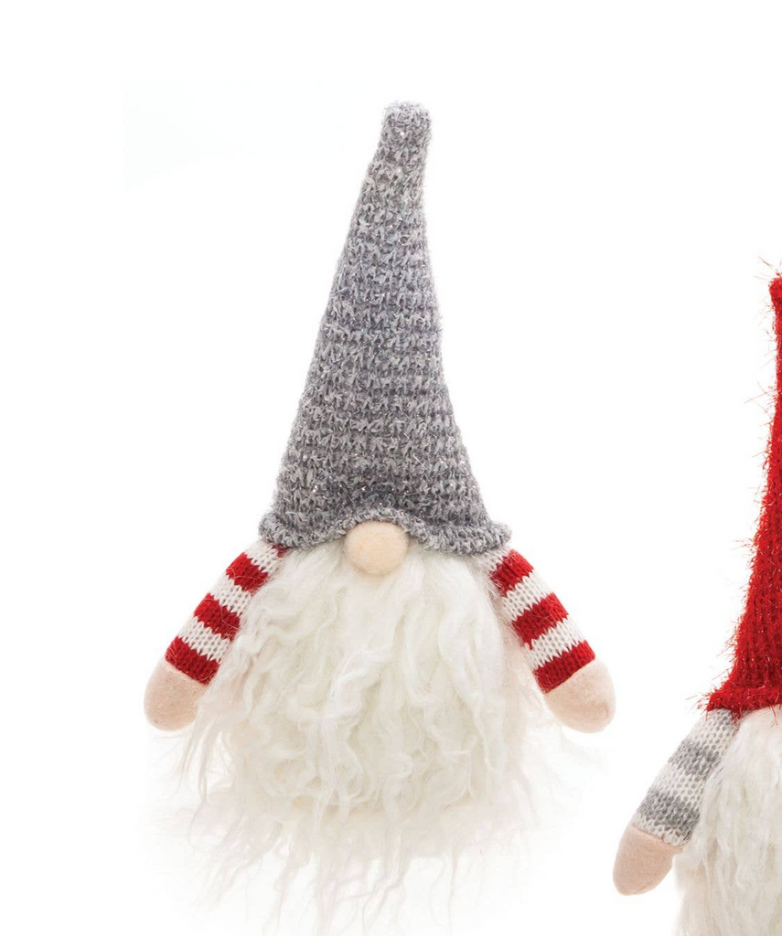 The Red/Gray Santa Gnome Ornaments are an assortment of two decorative plush gnome figurines made of long, fuzzy white material. The gnomes have round noses, plush striped arms, and pointed hats made of red or gray knit fabric. These gnomes bring a charming touch to a Christmas tree during the holiday season, displayed on branches using the string hangers.