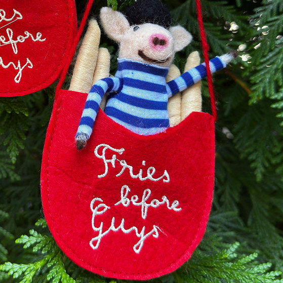 Made from soft felt and full of personality, this ornament is perfect for anyone who believes that carbs > crushes. Whether she's hanging from your tree, gracing your desk, or inspiring your snack breaks, this pig is here to remind you that self-love and fries are the ultimate combo.