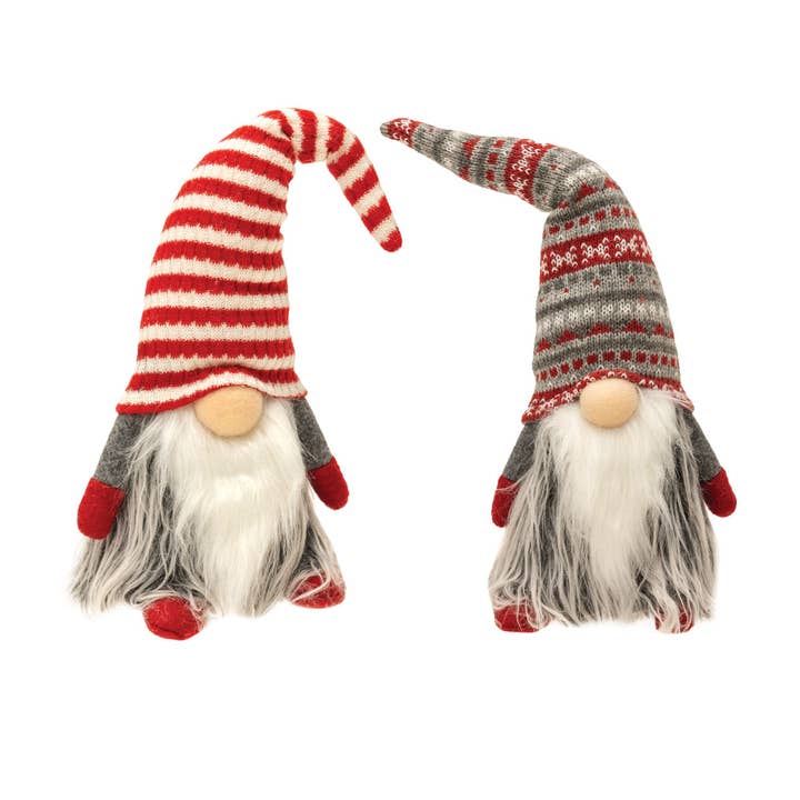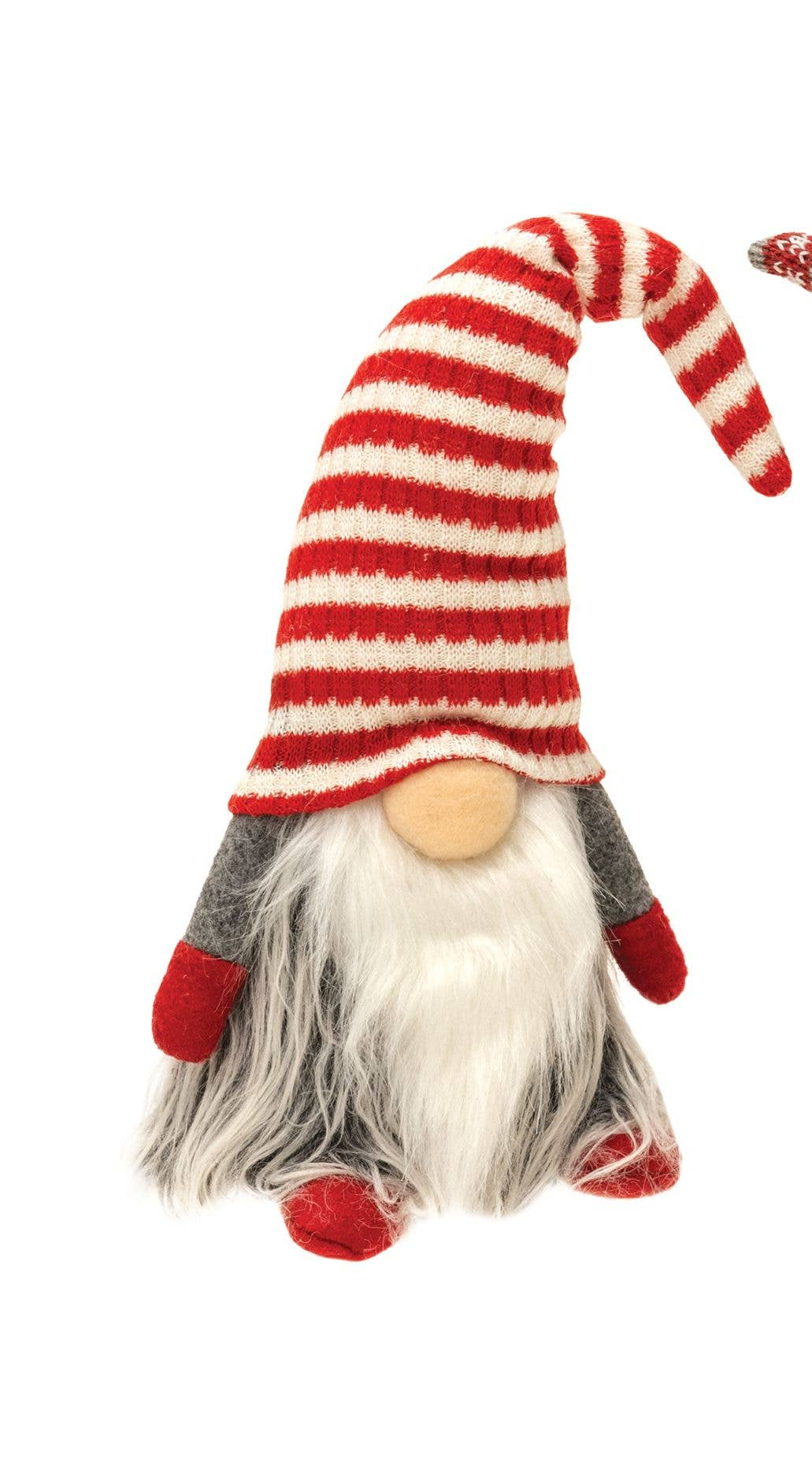 Santa Gnome with Striped Hat features an assortment of two freestanding gnomes. Each gnome has a Santa design with a fuzzy white beard, round nose, and a tall knit hat with a wire for adjustments. You can choose a Santa Gnome with a red striped hat or a gray patterned hat.