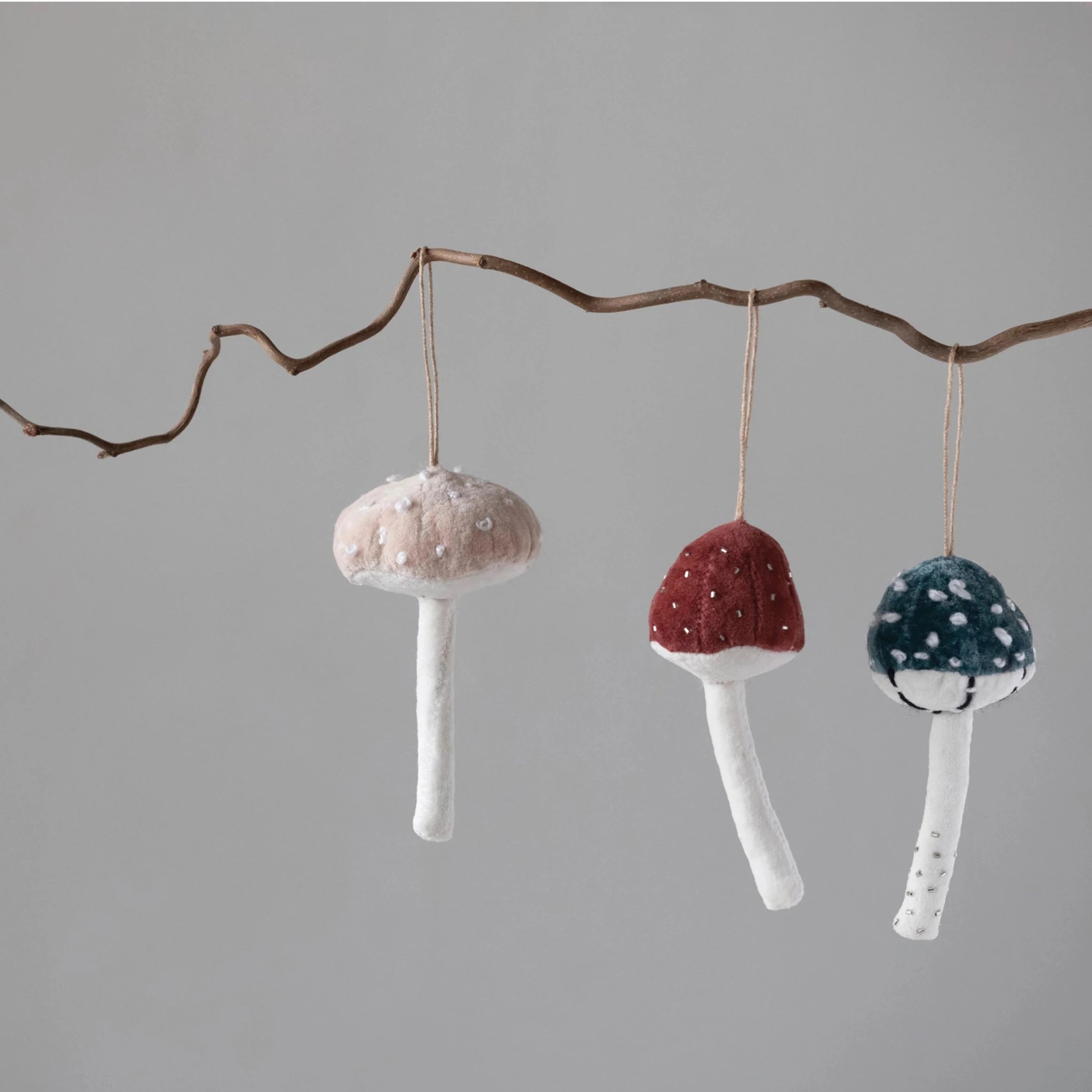 5-1/2"H Velvet Fabric Mushroom Ornament with Embroidery and Glass Beads, Multi Color, 3 Styles