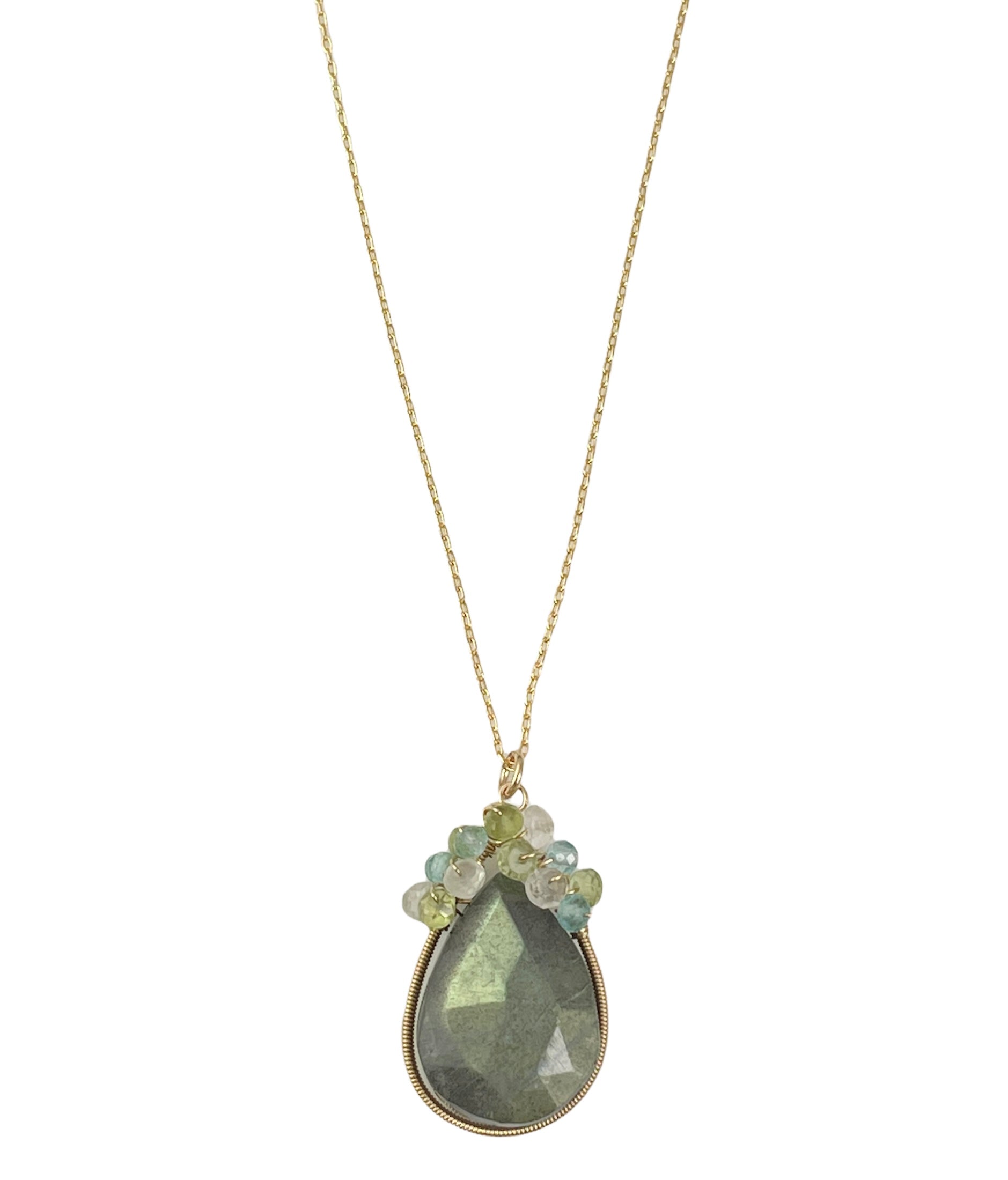This striking necklace from Lina's Shop showcases a large teardrop labradorite pendant, alive with flashes of blue, green, and silvery fire. Atop the glowing stone sits a delicate crown of tiny round moonstone, peridot, and topaz gems—each adding its own whisper of color and light. The moonstones glow with soft opalescence, the peridots lend a fresh green sparkle, and the topaz stones brighten the piece with crisp, airy brilliance. Together, they frame the labradorite in a radiant, celestial accent, creating a pendant that feels both mystical and refined—an eye-catching centerpiece for any jewelry collection.