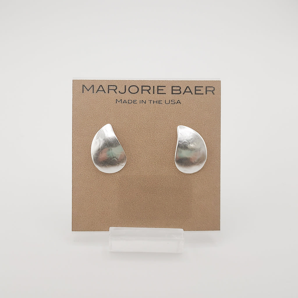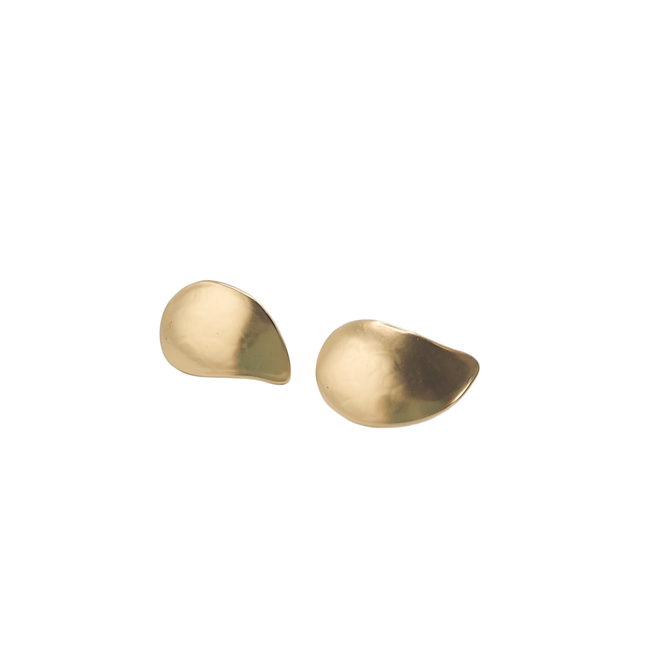 A lightly dished rounded teardrop in silver or brass. Clip on earring.