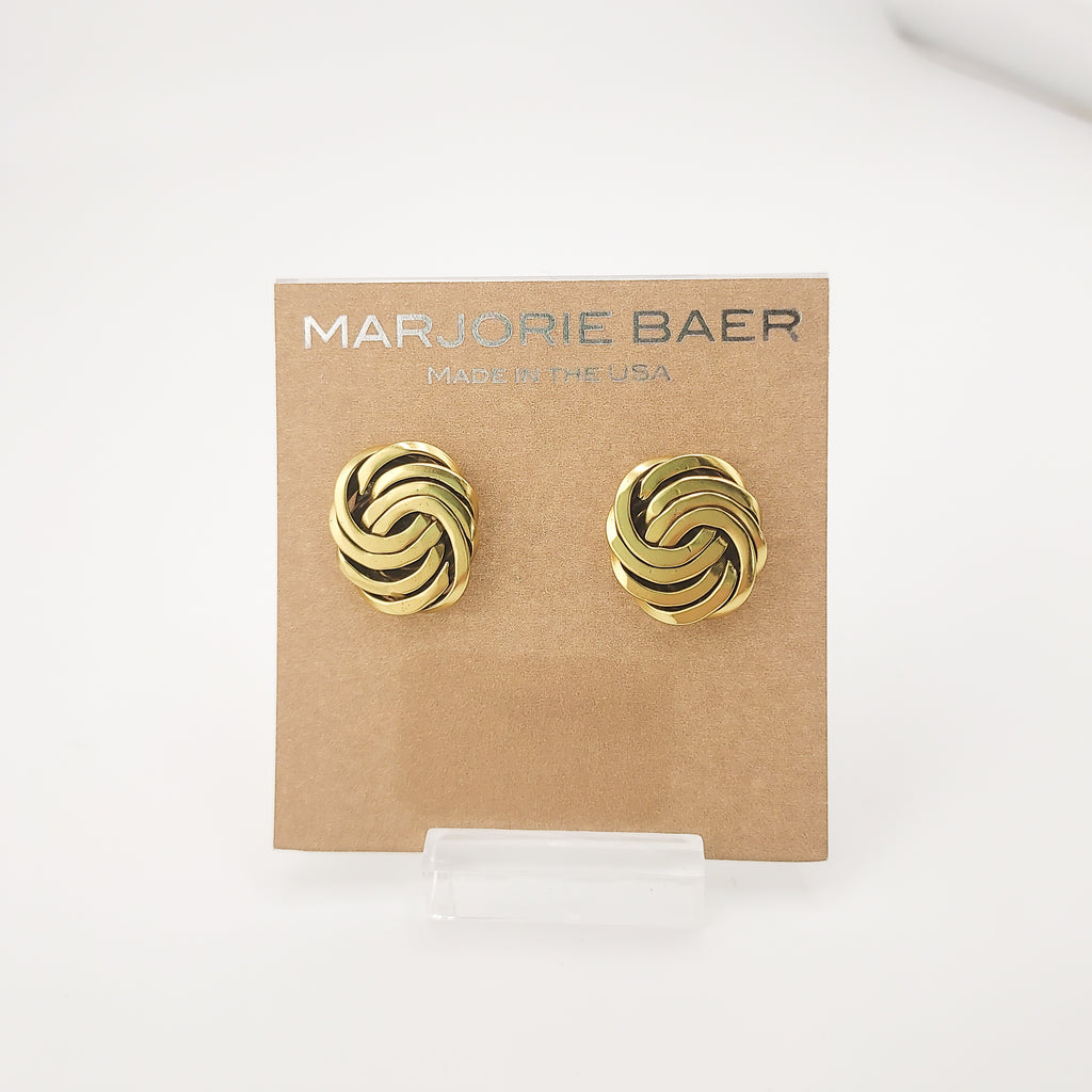 Marjorie Baer's intricate overlapping brass rings post earrings are sculptural and fun with a unique shape.