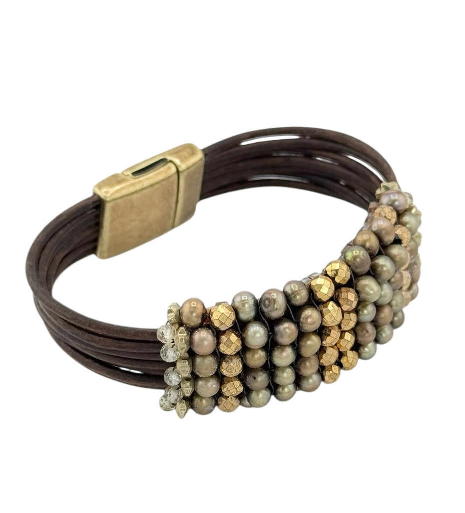 Sage Pearls with Pyrite Trim on Driftwood Leather