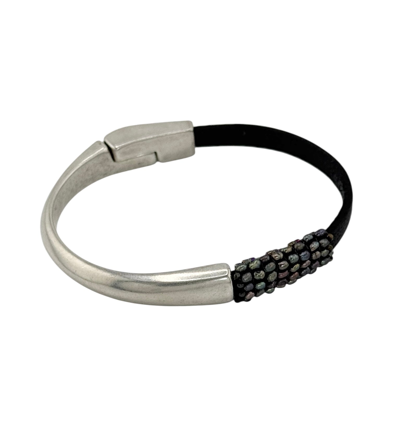 Tiny Peacock Rice Pearls on Black Leather Half Cuff