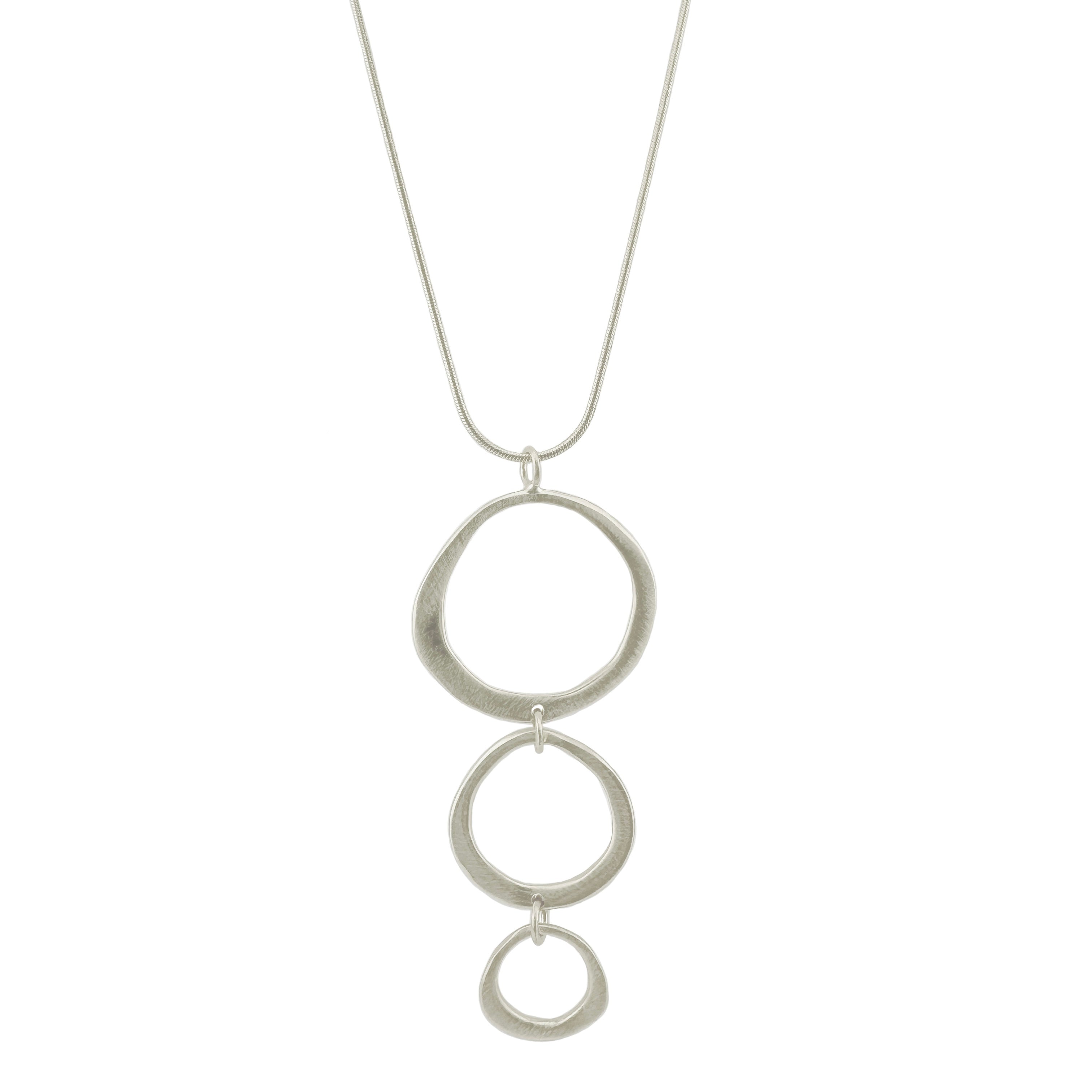 triple circle in silver or vermeil by Philippa Roberts. Pendant hangs approx. 2 1/2" long on a 18” snake chain. Item# 190-07 sn/vn. Our vermeil is sterling silver dipped in 16k gold. Findings are sterling silver and 14k gold fill. Handmade in Oakland, CA.
